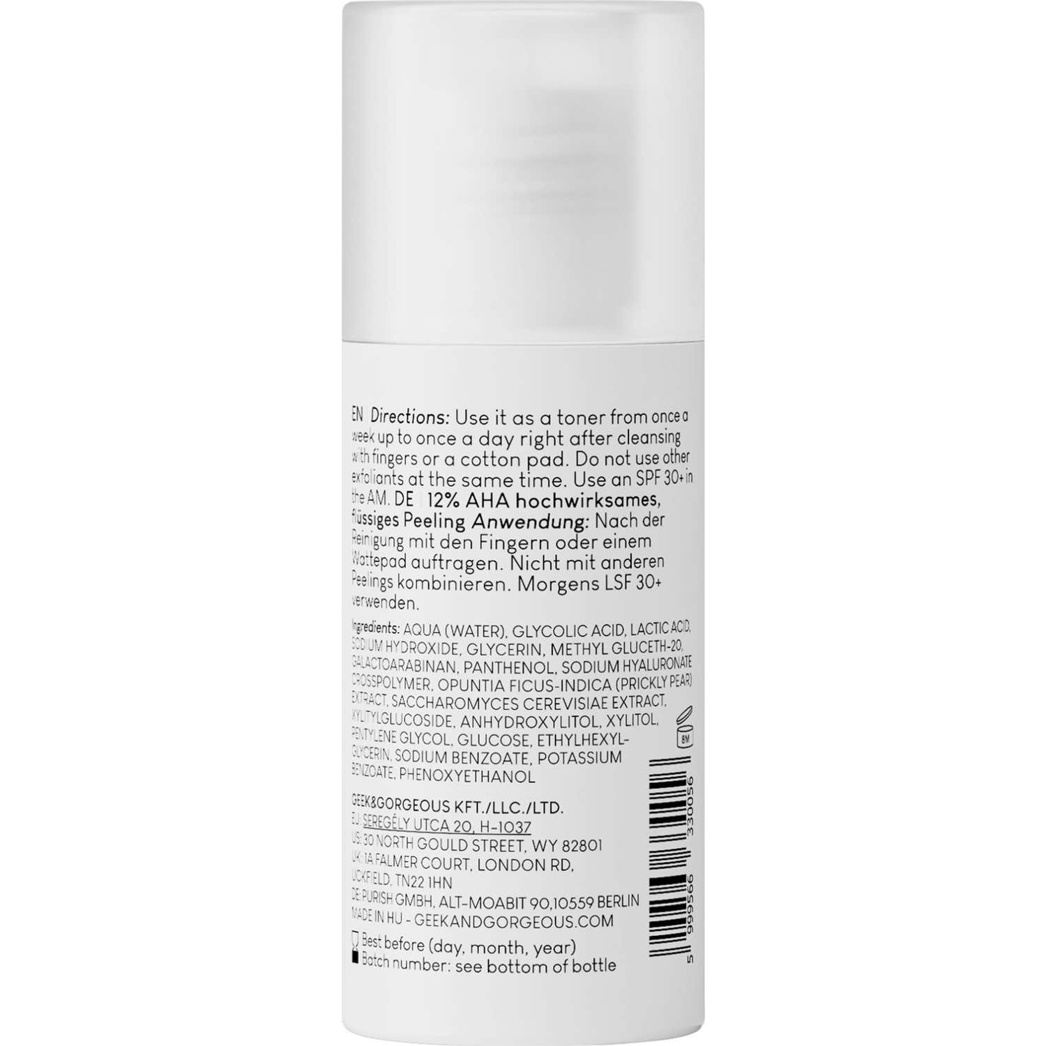 Geek & Gorgeous Smooth Out 12% AHA + Cactus Liquid es un exfoliante facial concentrado que combina un 12% de AHA con extracto de Cactus Nopal. Este producto está diseñado para ofrecer un tratamiento antienvejecimiento, promoviendo una piel más fresca, saludable y atractiva.