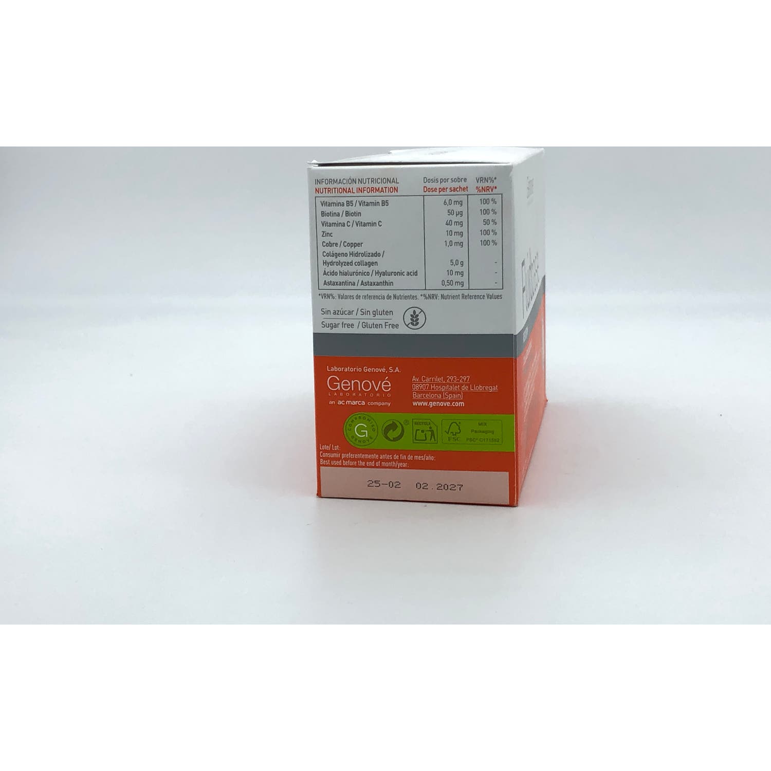 Genové Fluidbase Rederm Colágeno Bebible 20 sobres es un complemento alimenticio que nutre la piel des del interior del organismo, aportando colágeno y ácido hialurónico. Este nutricosmético estimula la regeneración de las células de la dermis, dejando un efecto de piel más joven y luminosa. A los 25 años de edad el organismo reduce la producción de colágeno.