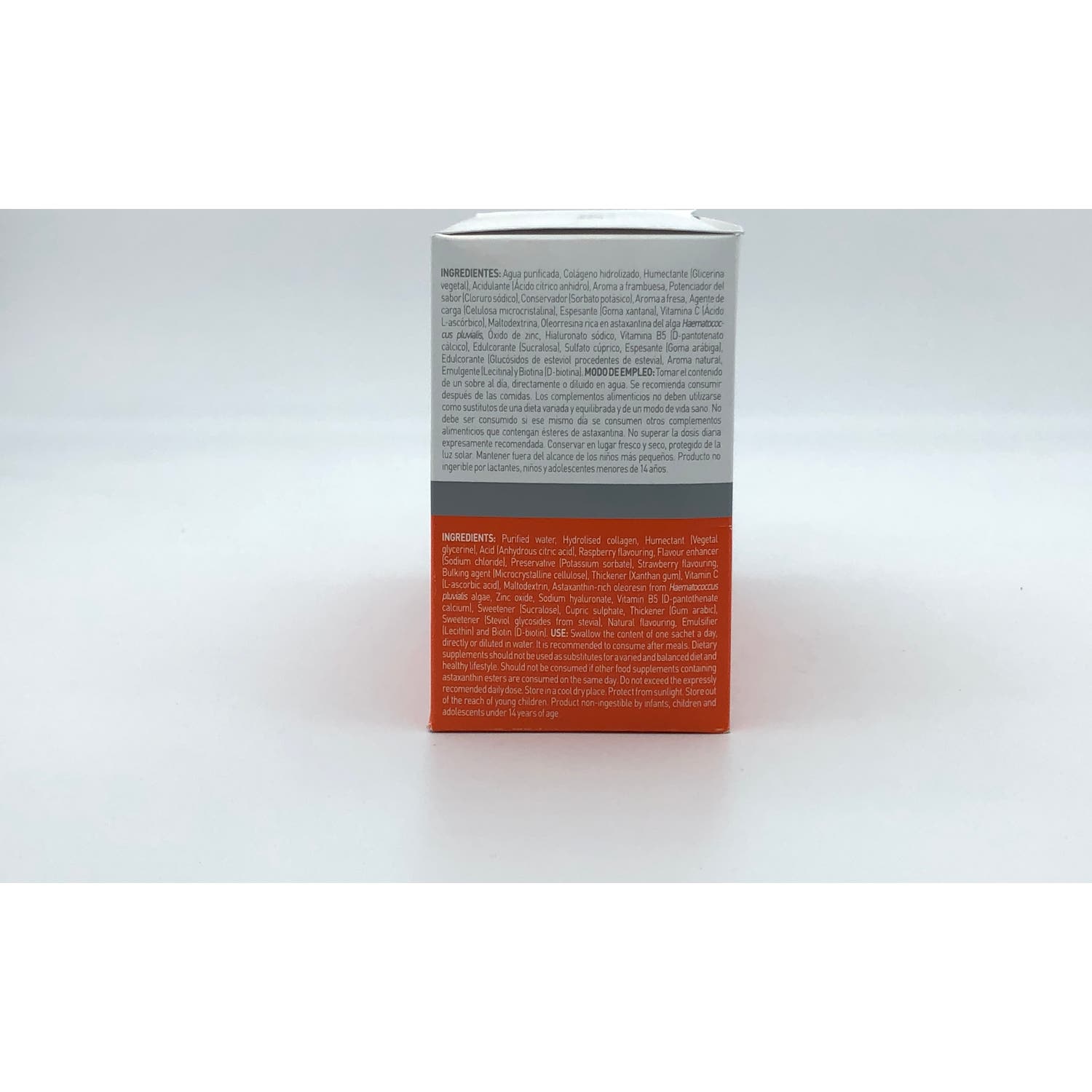 AGUA PURIFICADA, COLÁGENO HIDROLIZADO, HUMECTANTE (GLICERINA VEGETAL), ACIDULANTE (ÁCIDO CÍTRICO ANHIDRO), POTENCIADOR DEL SABOR (CLORURO SÓDICO), ESTABILIZADOR (CELULOSA MICROCRISTALINA), AROMA DE FRAMBUESA, CONSERVANTES (SORBATO POTÁSICO), VITAMINA C (ÁCIDO ASÓRBICO), SUNACTIVE ZN (61% MALTODEXTRINA, 30% ÓXIDO DE ZINC, 6% ÉSTERES POLIGLICÉRICOS DE ÁCIDOS GRASOS, 1% AGUA, 0.02% LECITINA HIDROLIZADA), CONCENTRADO DE HAEMATOCOCCUS PLUVIALIS RICO EN ASTAXANTINA (2.5%), ESPESANTE (GOMA XANTANA), ÁCIDO HIALURÓNICO, VITAMINAB5 (PANTOTENATO CÁLCICO), EDULCORANTE (SUCRALOSA), SULFATO DE COBRE, EDILCORANTE (STEVIAGLICÓSIDOS, BIOTINA.