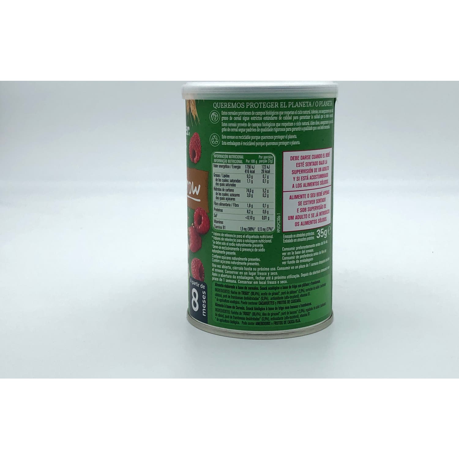 Elaborado a base de Trigo y Arroz con Frambuesa con certificado verde que significa formulado a partir de productos procedentes de la agricultura ecológica. No contiene aceite de palma ni azúcares añadidos, solo contiene los azúcares naturalmente presentes.