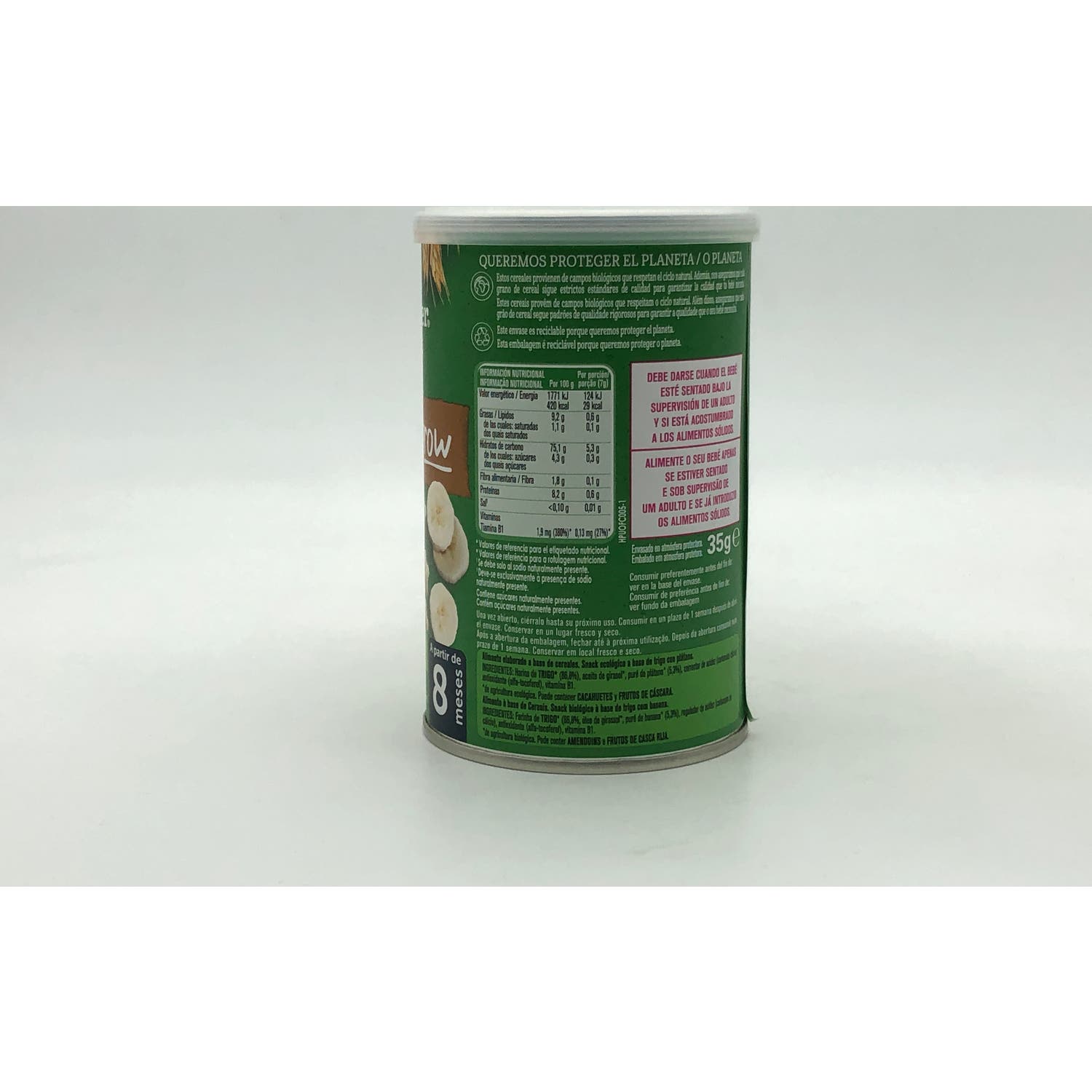 Formulado a base de cereales y plátano, que aportan vitaminas y minerales y ayudan al adecuado desarrollo de los infantes. Además, contiene vitamina B1, que contribuye al normal funcionamiento del cerebro. Recomendado como snack o merienda. Sin azúcares añadidos, conservantes, colorantes ni aceite de palma.