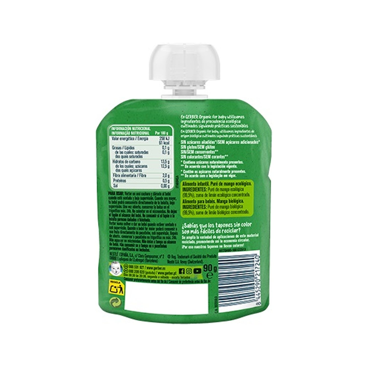 Gerber Organic Puré Mango 90g es un puré de frutas para bebés en edad de comer alimentos cremosos en una práctica bolsa con tapa hermética.
