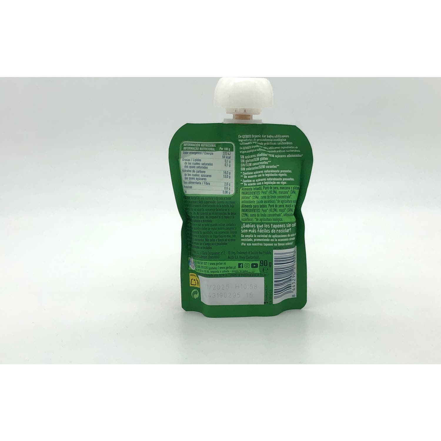 Elaborado a base de Pera, Manzana y Plátano con certificado verde que significa que está elaborada a partir de productos procedentes de la agricultura ecológica. No contiene aceite de palma ni azúcares añadidos, solo contiene los azúcares naturalmente presentes.