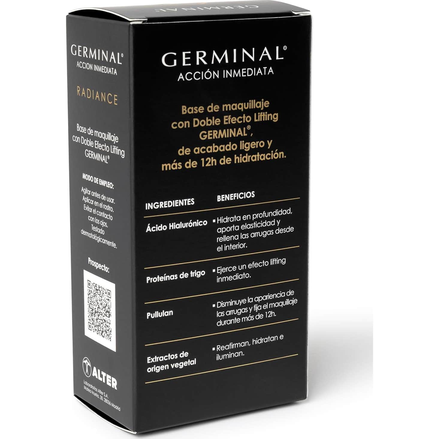 Germinal Radiance Lift Serum Foundation Medium Dark es una base de maquillaje que ofrece un acabado ligero y natural en un tono oscuro. Este producto está formulado con Doble Efecto Lifting GERMINAL® y ácido hialurónico, proporcionando una hidratación profunda, luminosidad y un efecto rejuvenecedor instantáneo que perdura durante más de 12 horas.