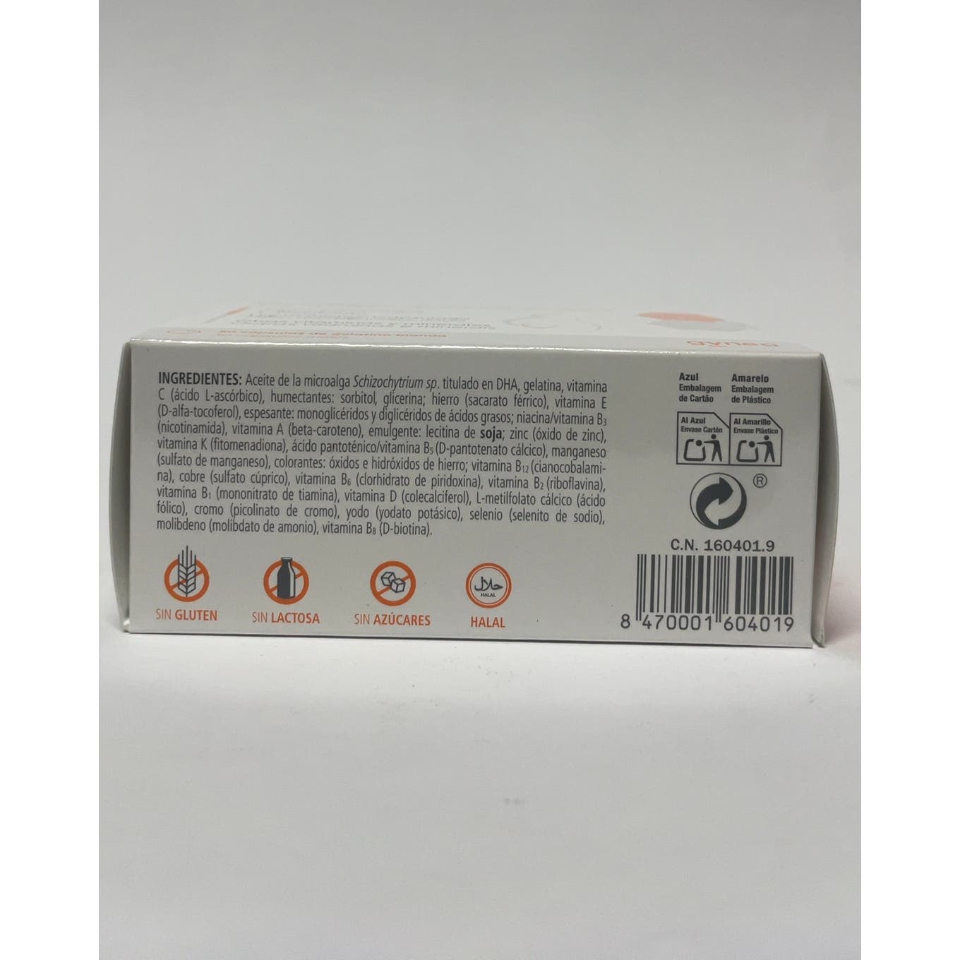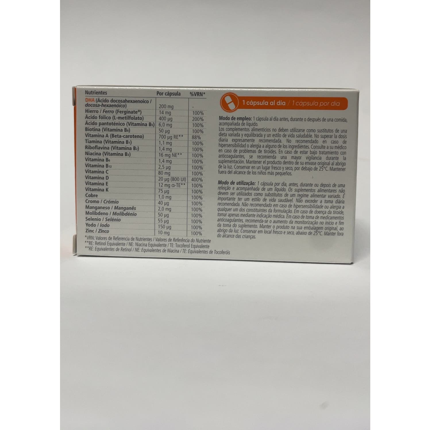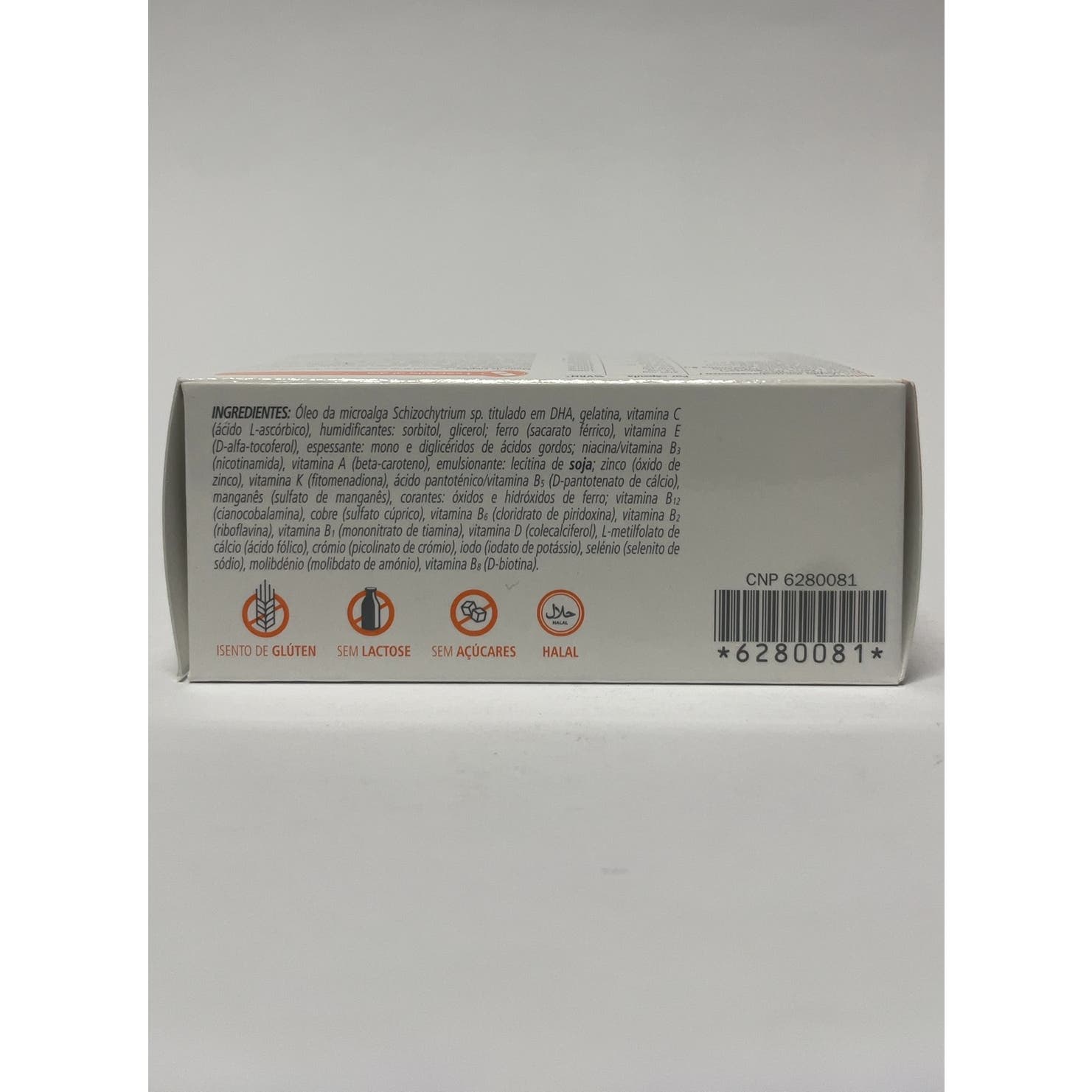 Contiene DHA de microalgas, para el desarrollo del cerebro y la visión del feto, Ácido fólico, Vitamina C, Yodo, Hierro y Vitamina D, que favorece la absorción del calcio y beneficia el crecimiento óseo del futuro bebé.