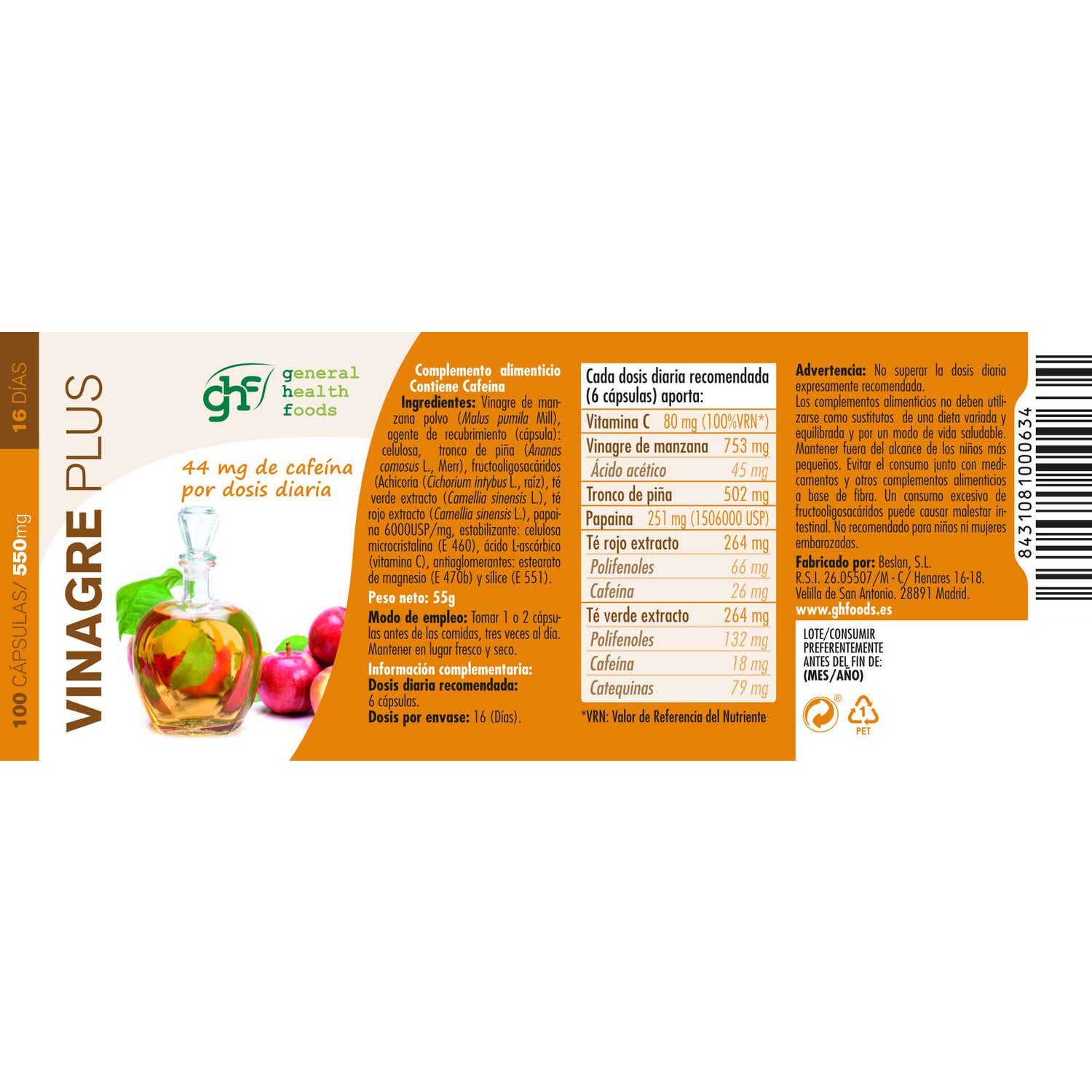 GHF Vinagre Plus es un complemento alimenticio idóneo para complementar dietas de adelgazamiento. GHF Vinagre Plus está compuesto por diferentes sustancias: