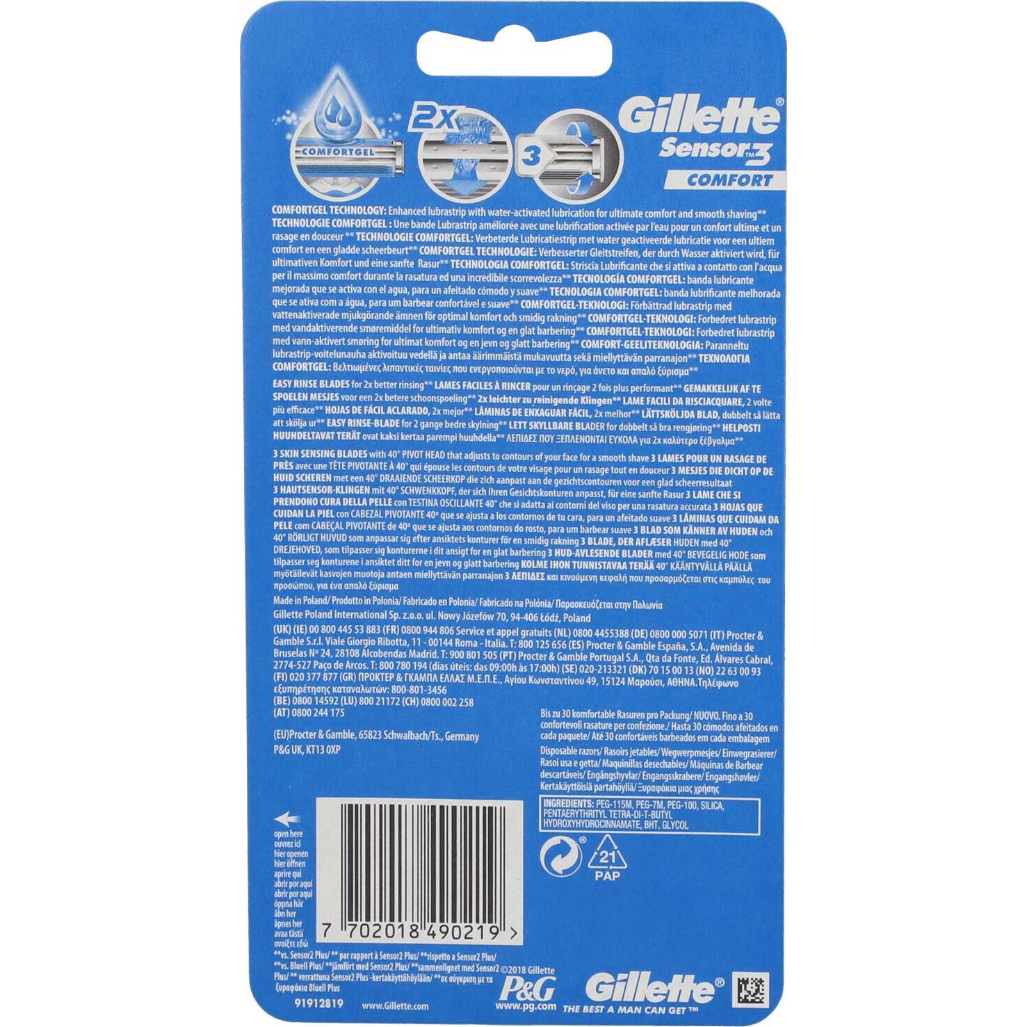 Gillette Sensor 3 Comfort Lâmina Descartável 3 Unidades es una maquinilla de afeitar desechable diseñada para ofrecer una experiencia de afeitado cómoda y eficaz. Este modelo cuenta con: