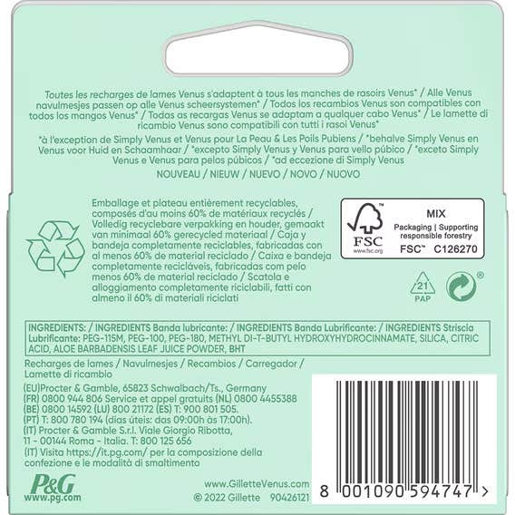 Cabezales de recambio para la maquinilla femenina Venus de Gillette. Su diseño presenta la primera maquinilla con 3 hojas específicas para la piel de las mujeres. Incluye 3 hojas curvadas rodeadas por almohadillas protectoras que alisan la piel, ofreciendo una depilación apurada y limpia en solo una pasada. Además, incluye una banda indicadora azul que va perdiendo el color para avisar cuando ya no tenga una acción efectiva en el depilado.
