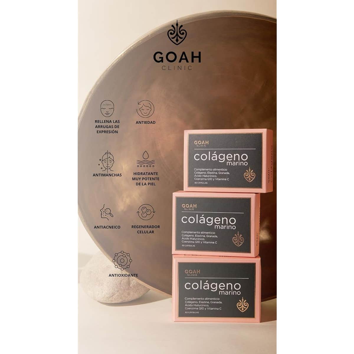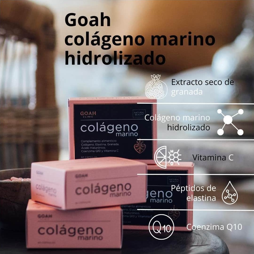 Goah Clinic Colageno Marino 60caps complemento alimenticio a base de colágeno marino y compuestos que están presentes en nuestra piel pero que con el paso del tiempo van disminuyendo, esto provoca la aparición de líneas de expresión, arrugas y otros signos de envejecimiento en la piel.