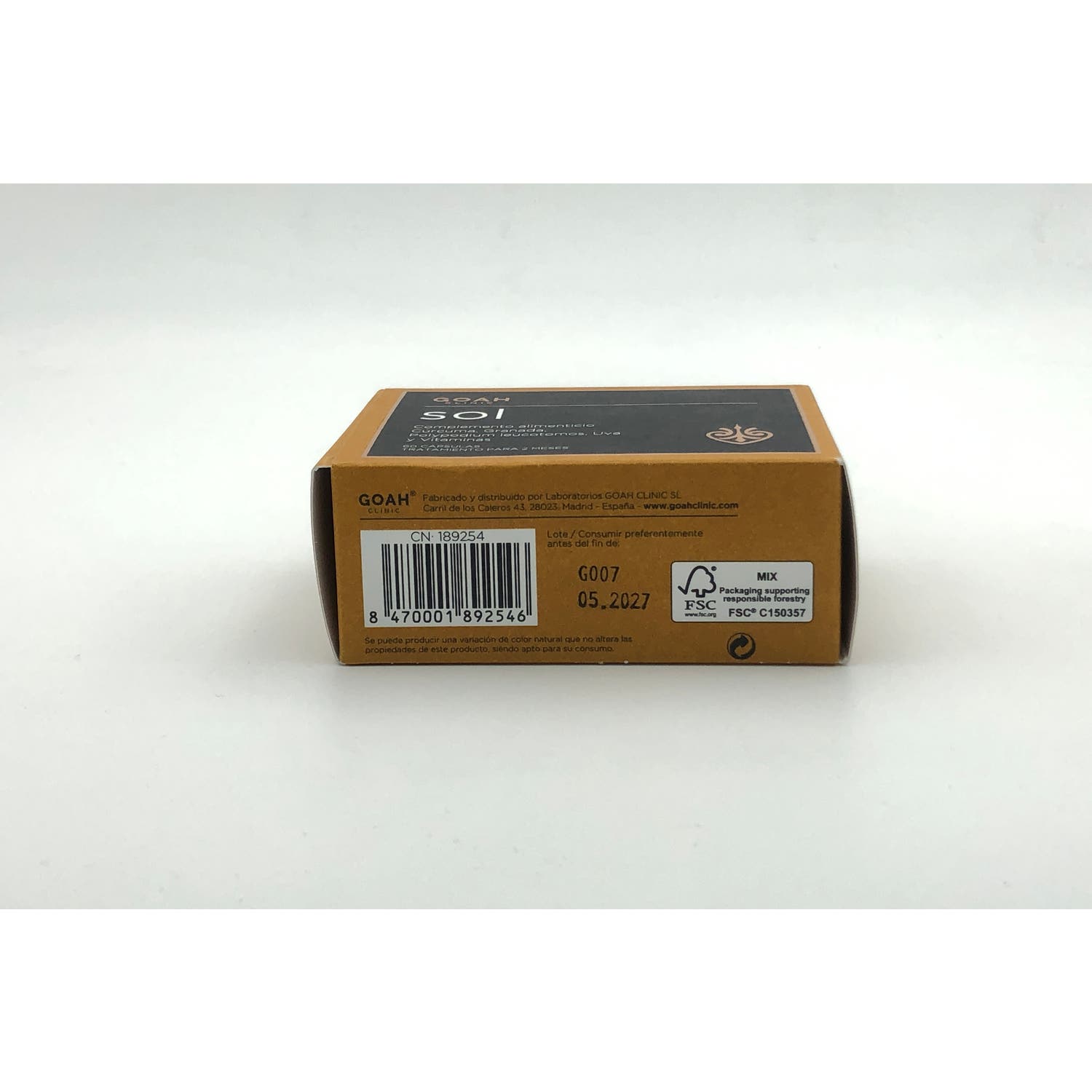 Goah Clinic Sol 60caps complemento alimenticio a base de Cúrcuma, Granada, Polypodium Leucotomos, Uva y Vitaminas que tienen grandes propiedades antioxidante beneficiosas para nuestra piel. Actúa como protector solar y reduce la aparición de nuevas manchas en la piel causadas por rayos UV. Ideal para períodos de exposición al sol. Combate con la disminución de la densidad de la masa ósea, aportando más fuerza y resitencia a los huesos.
