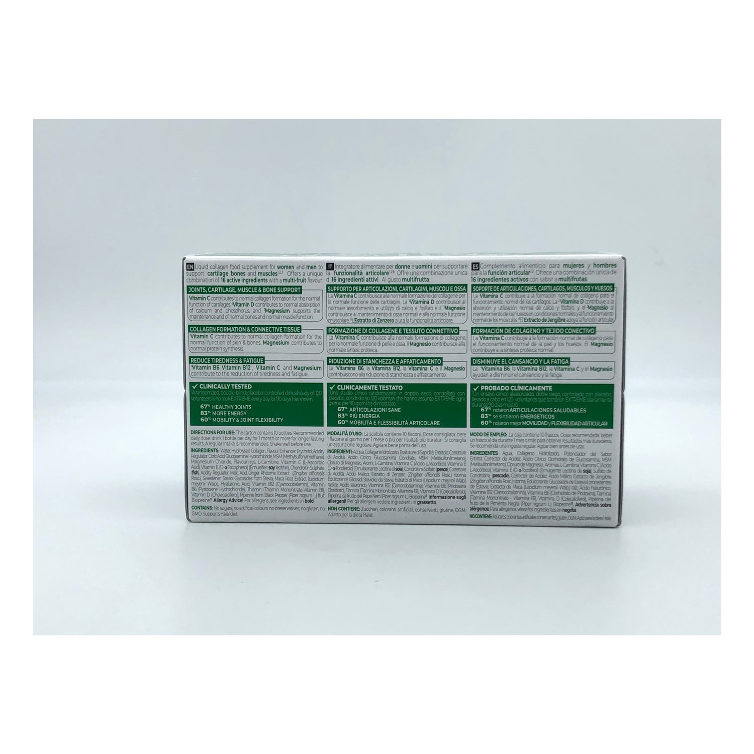 Elaborado a base de condroitina, glucosamina, ácido hialurónico y vitaminas B1, B5, B12, C, D y E. Además de Colágeno Hidrolizado Bovino de primera calidad de fácil absorción.