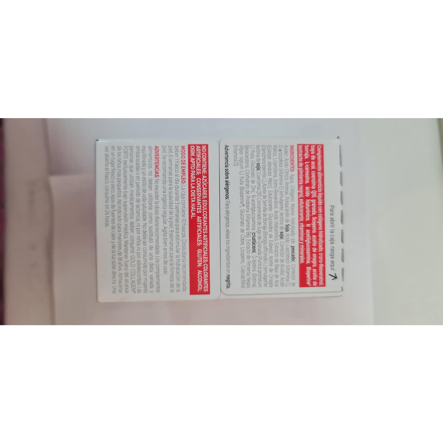 Agua, Colágeno Marino Hidrolizado (de pescado), Corrector de D-α-tocoferol (Vitamina E) (emulgente: lecitina de soja), Corrector de Acidez: Ácido (Oenothera biennis L.), Aceite de Semilla de Borraja (Borago officinalis L.) (emulgente: Acidez: Ácido Cítrico; Aromas, Polisacárido de Soja, Ácido L-ascórbico (Vitamina C), (Euterpe oleracea Mart.), Edulcorante: Glucósidos de Esteviol; Aceite de Onagra lecitina de soja), Coenzima Q10, Concentrado de Jugo de Granada (Punica granatum L.) fruta, Gluconato de Zinc, N-acetilglucosamina (crustáceos), D-biotina (Biotina), Betacaroteno, Clorhidrato de Piridoxina (Vitamina B6), Extracto de Pimienta Negra (Piper nigrum L.) fruta (Bioperine ), Gluconato de Cobre, Licopeno, Colecalciferol (extractodepimientanegra), edulcorante, vitaminasyminerales. Málico; L-carnosina, trans-Resveratrol; Ácido Hialurónico, Extracto de Baya de Acai ® (Vitamina D). Advertencia sobre alérgenos: Para alérgenos, véase los ingredientes en negrita.