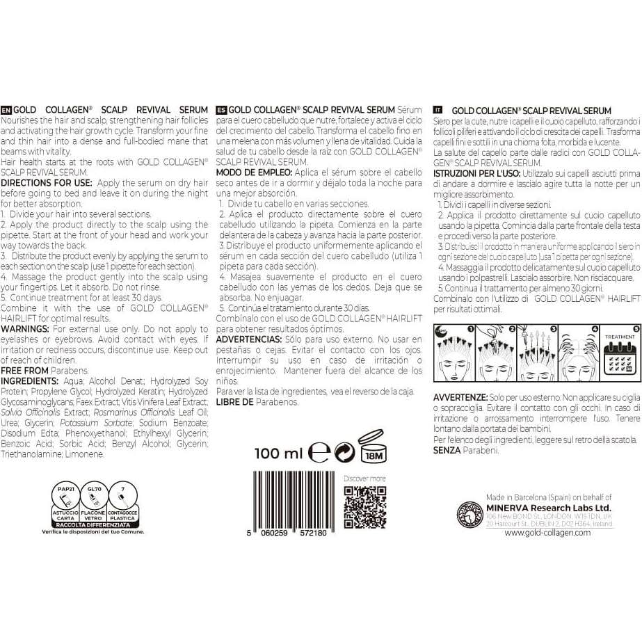 El SÉRUM GOLD COLLAGEN® SCALP REVIVAL actúa desde la raíz, proporcionando los nutrientes esenciales que permiten transformar el cabello fino y frágil en una melena voluminosa y sedosa. Se recomienda consultar a un profesional para un uso adecuado del producto.