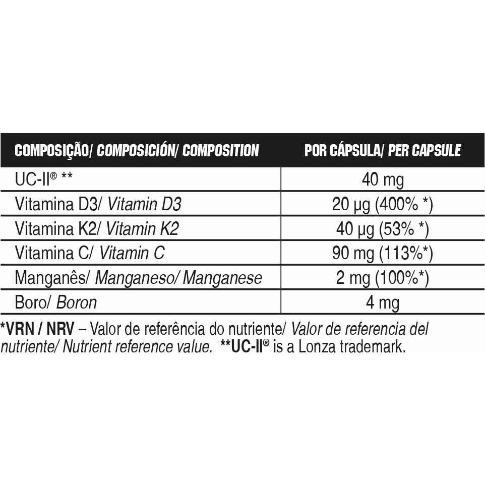 Ingredientes Harina de arroz, agente de recubrimiento (E464), ácido L-ascórbico, UC-II® (cartílago estandarizado con colágeno tipo II (nativo) no desnaturalizado, estabilizador (E508)), borato sódico, menaquinona, gluconato de manganeso, antiaglomerantes (E470b, E551), colecalciferol. Puede contener trazas de leche, soja, pescado y crustáceos.