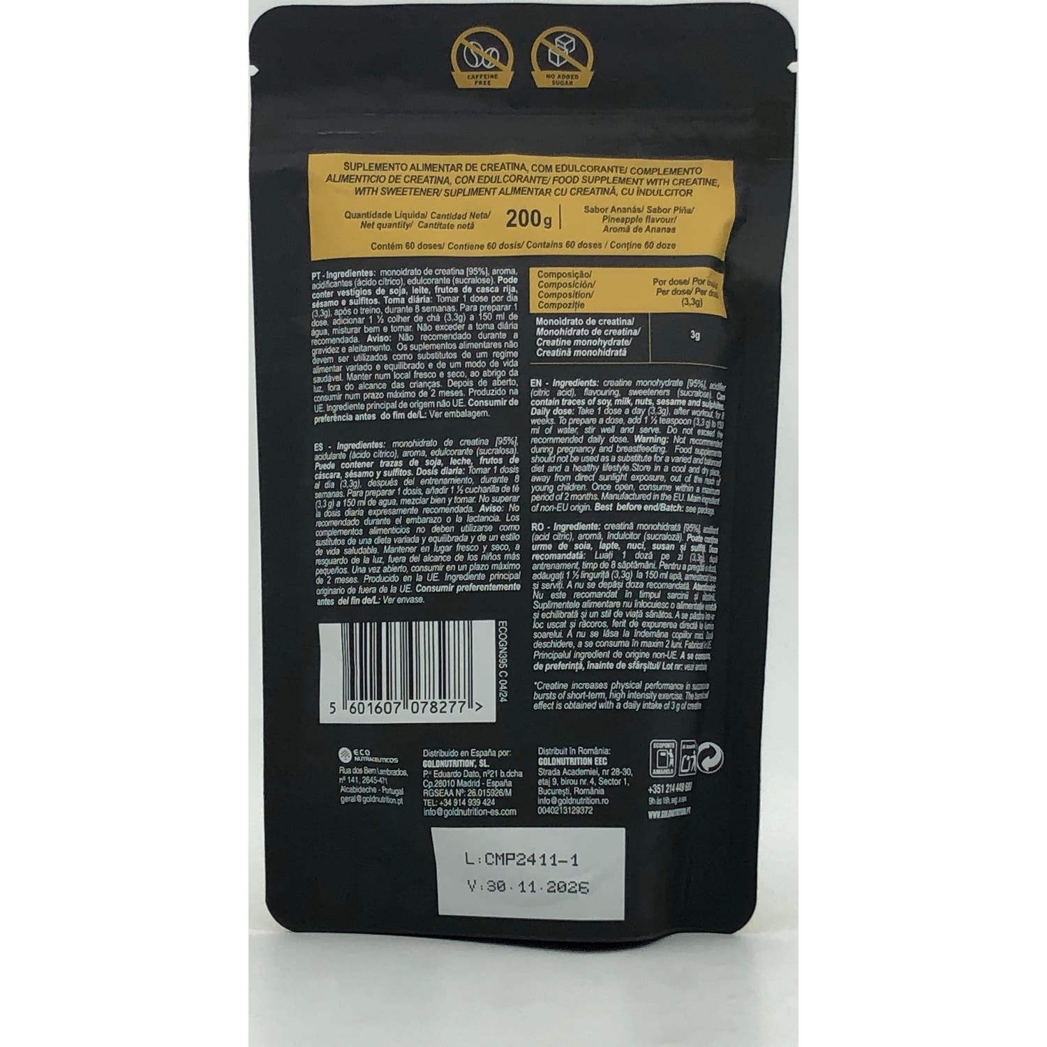 Gold Nutrition Creatine Monohydrate Pineapple 200gr es un complemento alimenticio de monohidrato de creatina con sabor a piña.