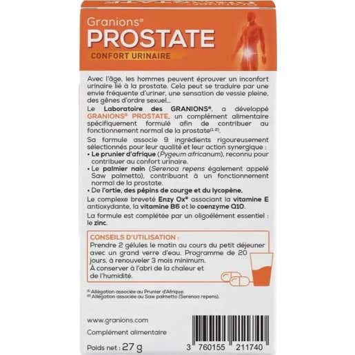 Granions Próstata Confort Urinario 40 Cápsulas es un complemento alimenticio que contribuye al funcionamiento normal de la próstata y al confort urinario. Su fórmula rica en ciruela africana ayuda a mejorar los trastornos urinarios del hombre, mientras que el Saw Palmetto contribuye al funcionamiento normal de la próstata. Este complemento alimenticio de los Laboratorios Granions también es rico en ortiga, semillas de calabaza, licopeno y zinc. También contiene el complejo patentado Enzy Ox, que combina la vitamina E antioxidante con la vitamina B6 y la coenzima Q10. Cápsula vegetariana. Los complementos alimenticios nunca deben sustituir a una dieta sana y equilibrada.
