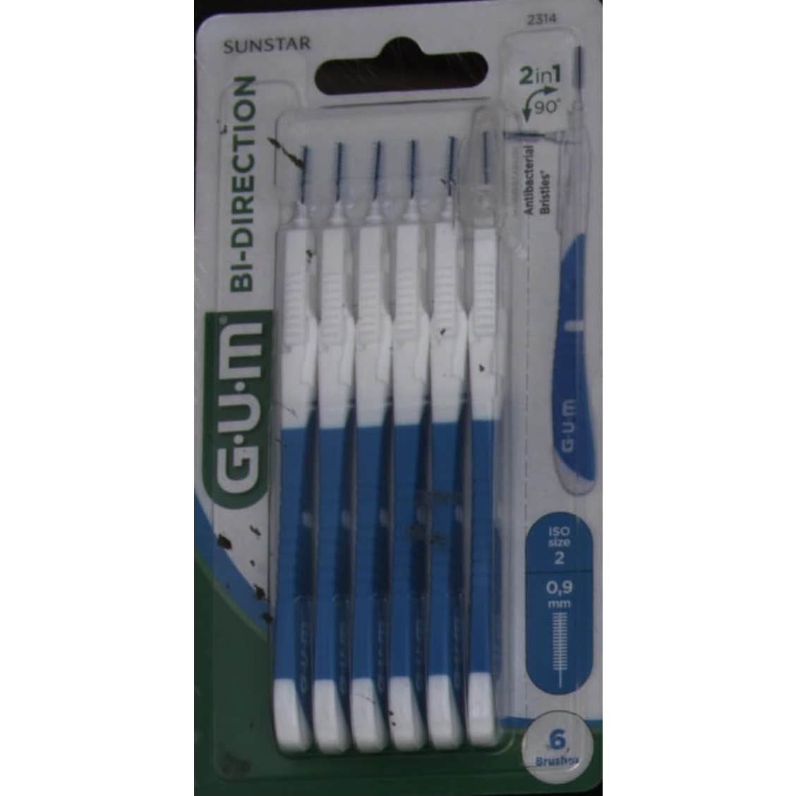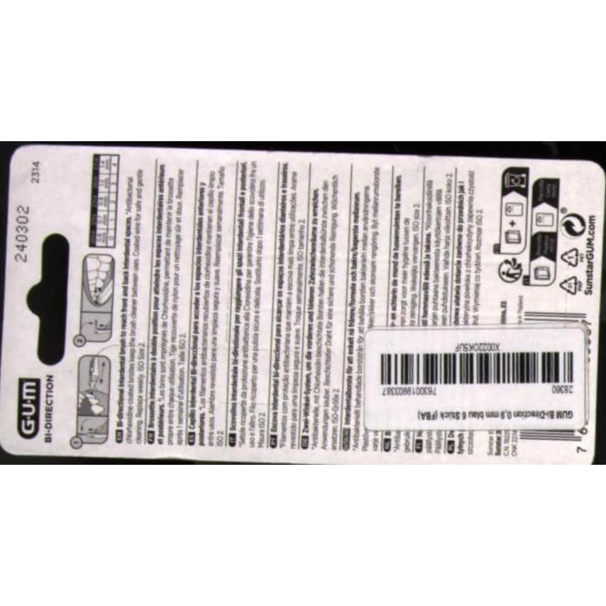 GUM Cepillo interdental Bi-Direction mediano 0.9mm 6uds cepillos interdentales que ayudan a eliminar los restos entre los espacios difíciles de alcanzar. Diseño giratorio que permite encajar en dos posiciones diferentes para limpiar diferentes partes de su boca.