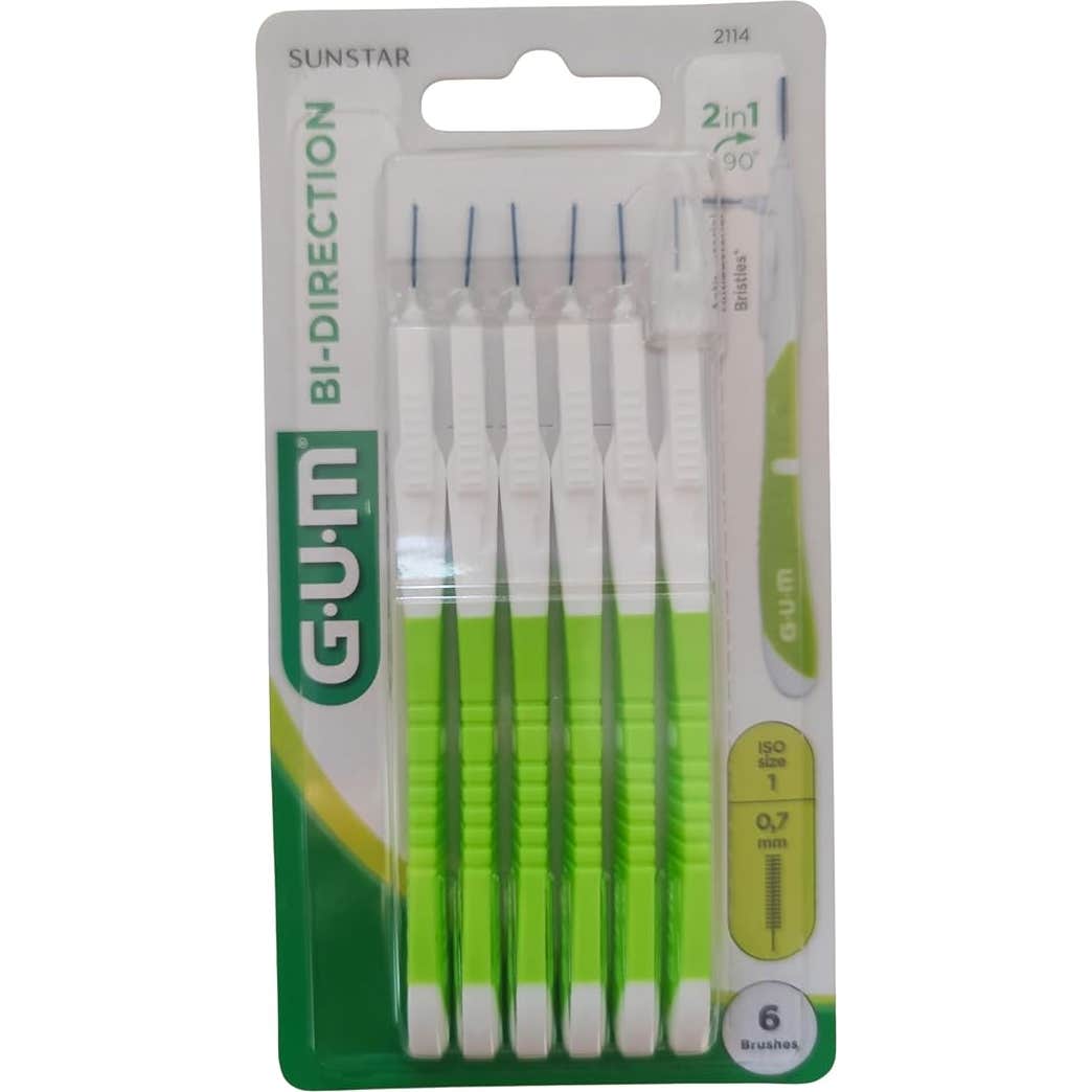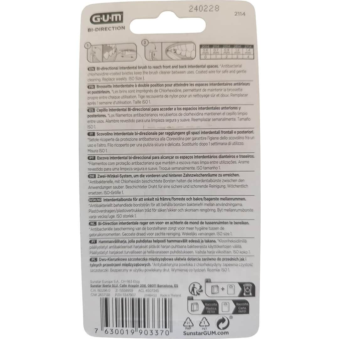 GUM Cepillo interdental Bi-Direction pequeño 0.7mm 6uds cepillos interdentales que ayudan a eliminar los restos entre los espacios difíciles de alcanzar. Diseño giratorio que permite encajar en dos posiciones diferentes para limpiar diferentes partes de su boca.