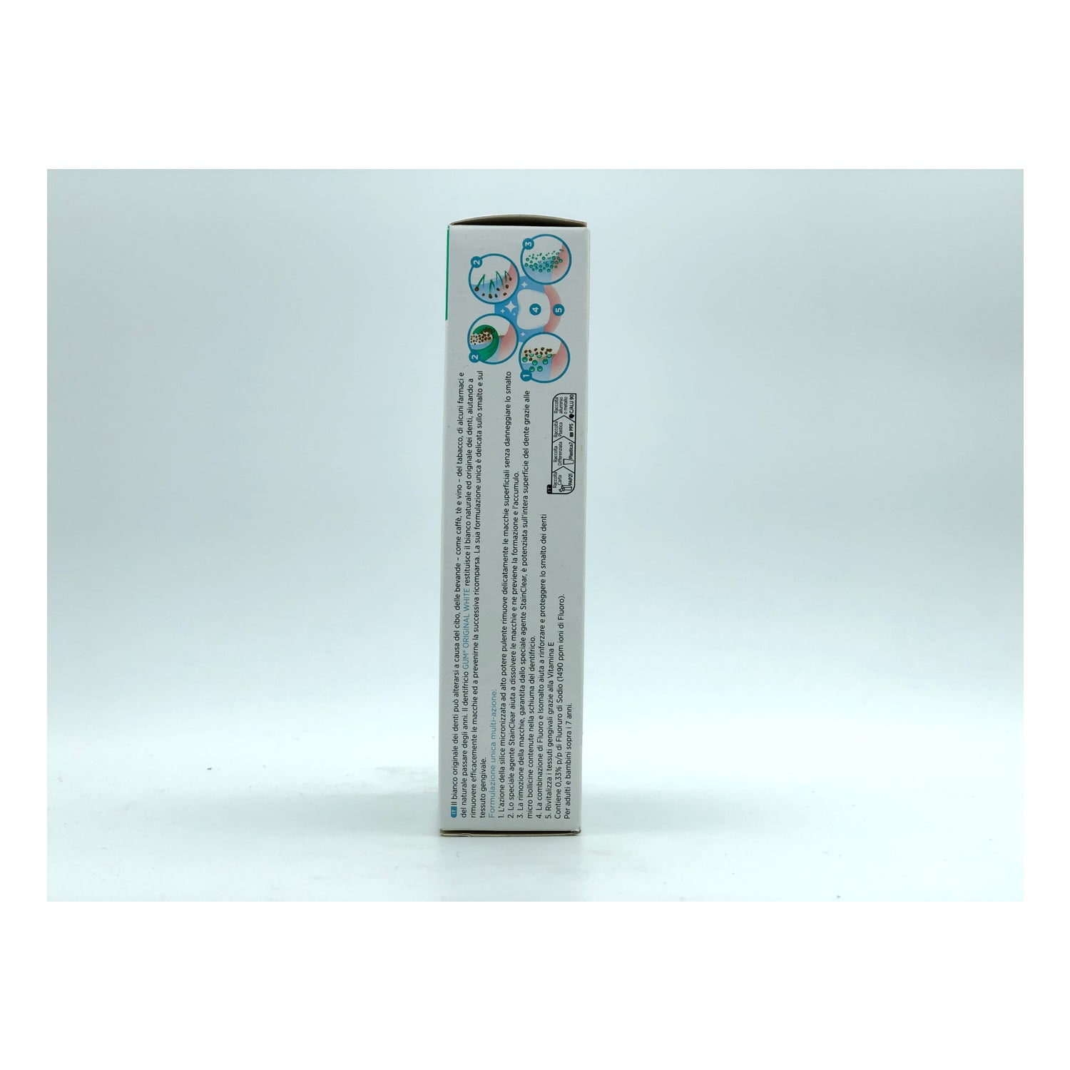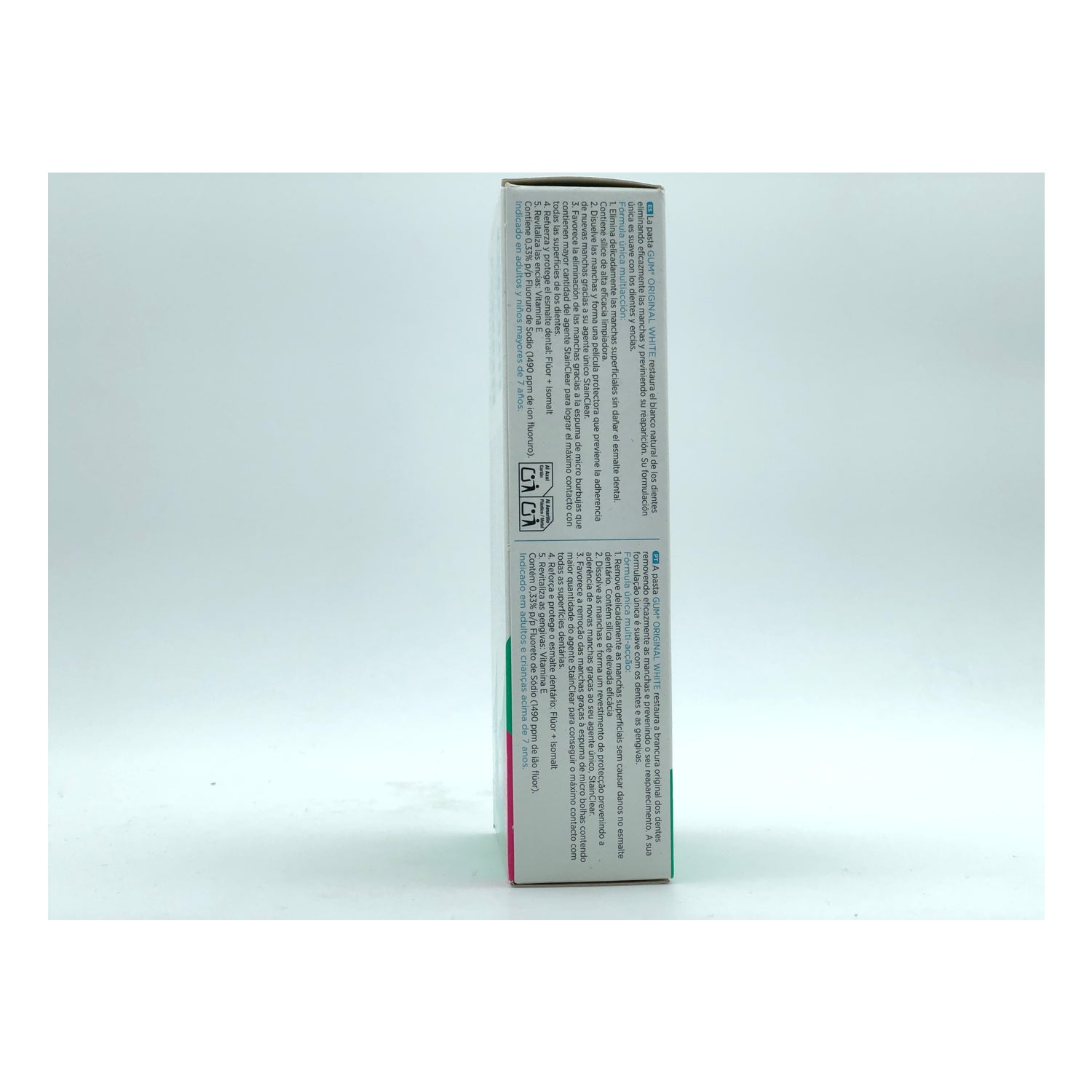 GUM Original White Pasta Dentífrica 2x75ml contiene una nueva fórmula mejorada que elimina delicadamente las manchas superficiales sin dañar el esmalte dental.