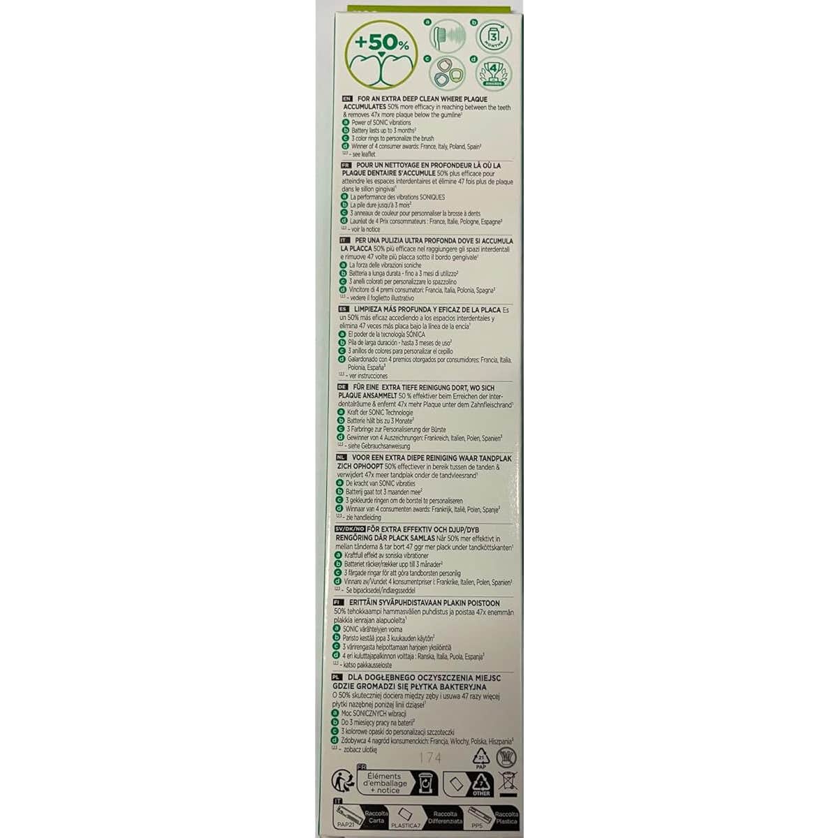el envase contiene un asa, cabezal de cepillado, tapa para transporte, pila aaa lr03, 3 anillos de colores y manual de instrucciones.