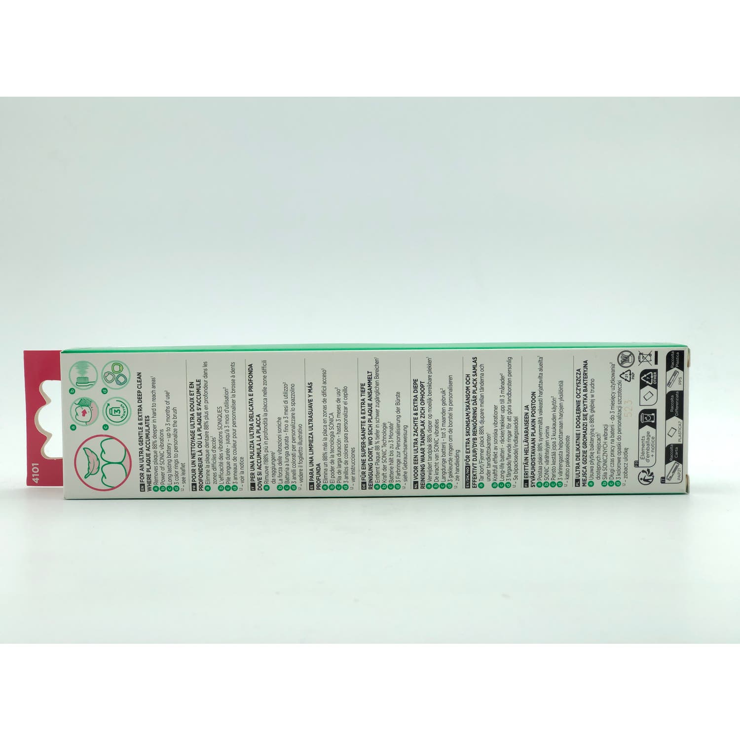 el envase contiene un asa, cabezal de cepillado, tapa para transporte, pila aaa lr03, 3 anillos de colores y manual de instrucciones.