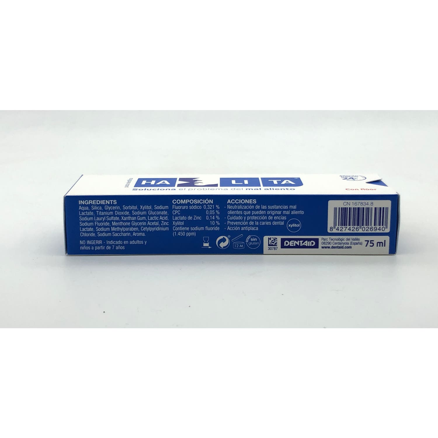 Halita Pasta Dentífrica 75ml es una pasta dentífrica que contribuye a refrescar el aliento y lucir unos dientes limpios y más blancos. Esta pasta dentífrica neutraliza las sustancias mal olientes que puede originar la conocida halitosis, revitaliza y protege las encías y, además, previene las caries y la formación de placa bacteriana.