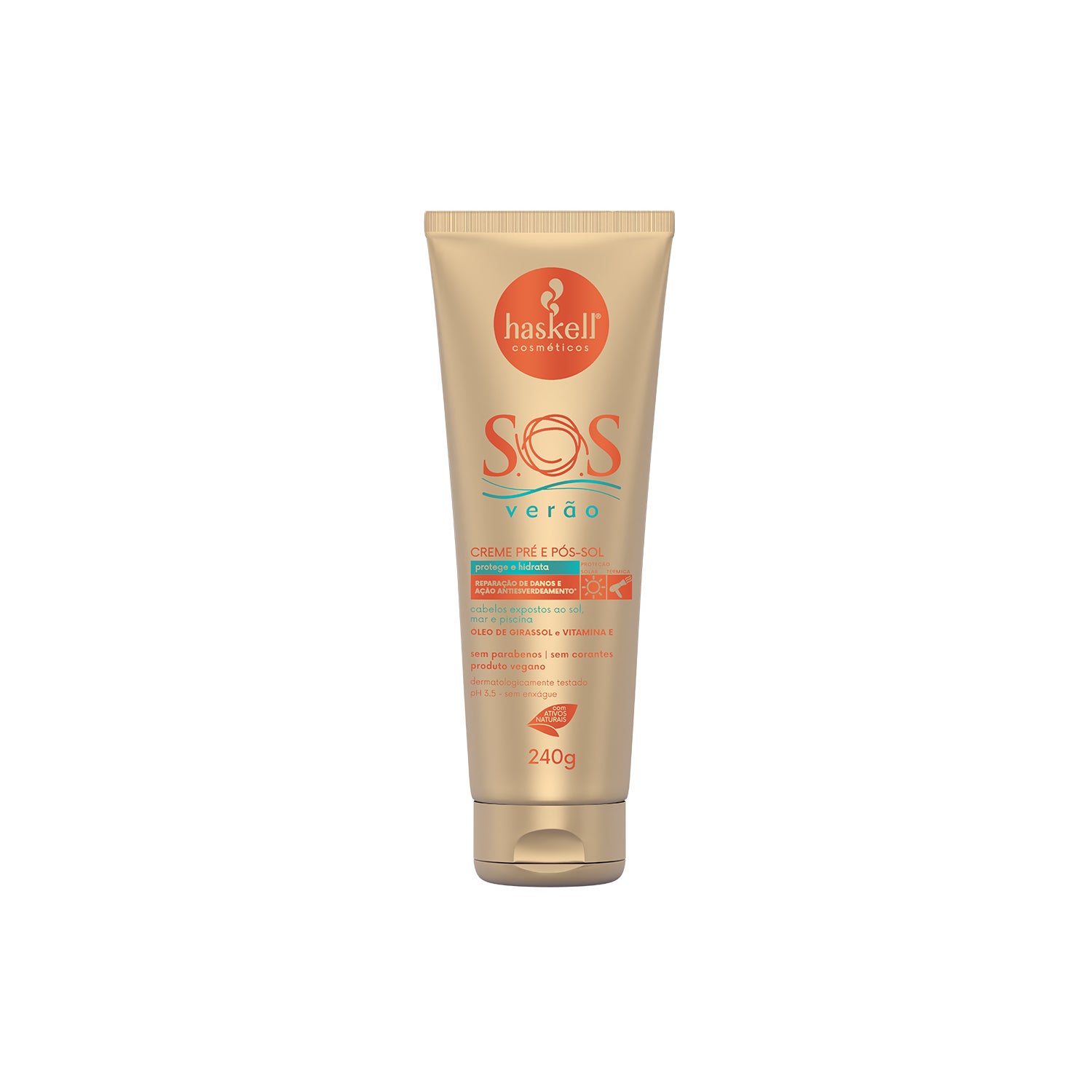 Haskell S.O.S Verão Creme Pré e Pós Sol 240g es un tratamiento diseñado para proteger y reparar el cabello expuesto al sol, mar y piscina. Ideal para quienes desean mantener el cabello sano, hidratado y brillante durante el verano o tras una exposición solar intensa.