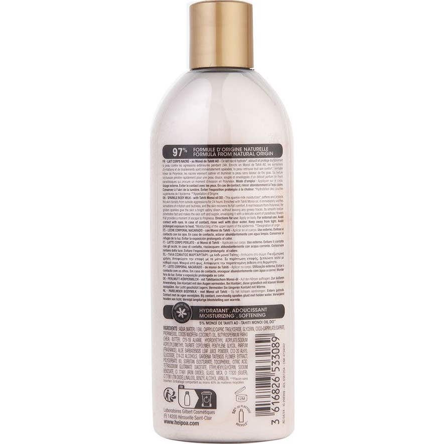 La fórmula de Hei Poa Leche Corporal Nacarada está compuesta en un 97% por ingredientes de origen natural, lo que asegura una hidratación prolongada de hasta 24 horas tras la aplicación. Se recomienda consultar con un profesional en caso de dudas sobre su uso o si se presentan reacciones adversas.
