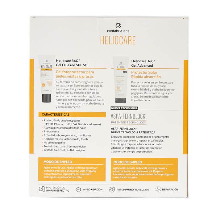 Heliocare 360º Set Gel Oil Free SPF50 50ml + Advanced Gel SPF50 100ml es un conjunto que ofrece una protección solar avanzada y efectiva. Este pack incluye dos productos destacados de la línea Heliocare, diseñados para proporcionar una cobertura completa frente a los daños causados por la radiación solar.
