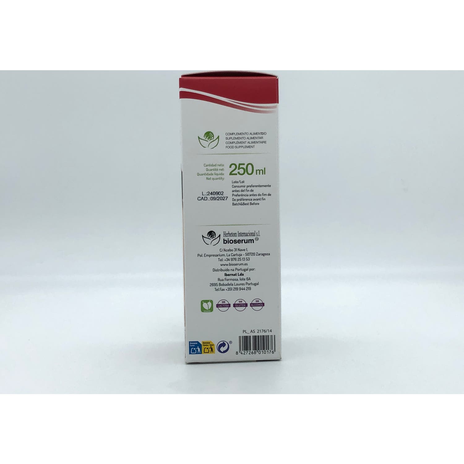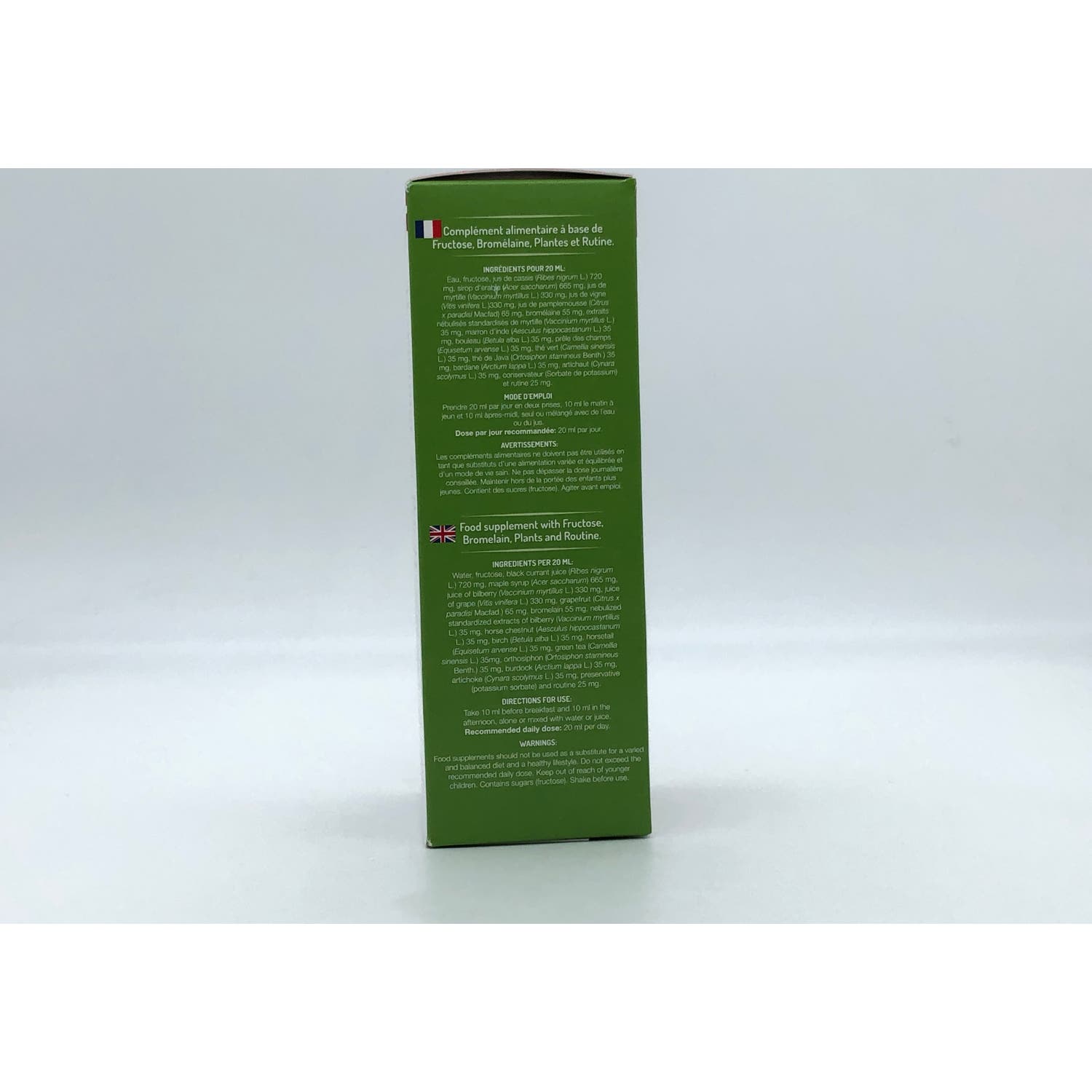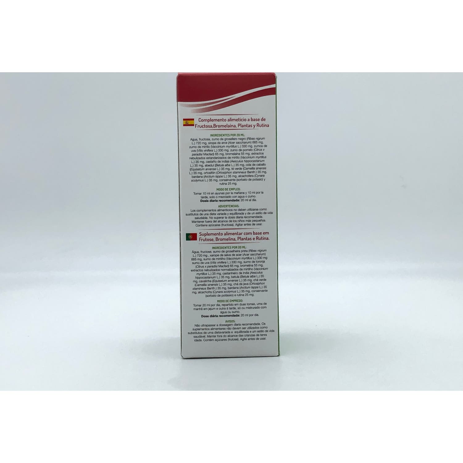 Ingredientes por 20ml: Agua, fructosa, zumo de grosellero negro (Ribes nigrum L.) 720 mg, sirope de arce (Acer saccharum) 665 mg, zumo de mirtilo (Vaccinium myrtillus L.) 330 mg, zumos de uva (Vitis vinífera L.) 330 mg, zumo de pomelo (Citrus x paradisi Macfad) 65 mg, bromelaína 55 mg, extractos nebulizados estandarizados de mirtilo (Vaccinium myrtillus L.) 35 mg, castaño de indias (Aesculus hippocastanum L.) 35 mg, abedul (Betula alba L.) 35 mg, cola de caballo (Equisetum arvense L.) 35 mg, té verde (Camellia sinensis L.) 35 mg, ortosifón (Ortosiphon stamineus Benth.) 35 mg, bardana (Arctium lappa L.) 35 mg, alcachofera (Cynara scolymus L.) 35 mg, conservante (sorbato de potasio) y rutina 25 mg.