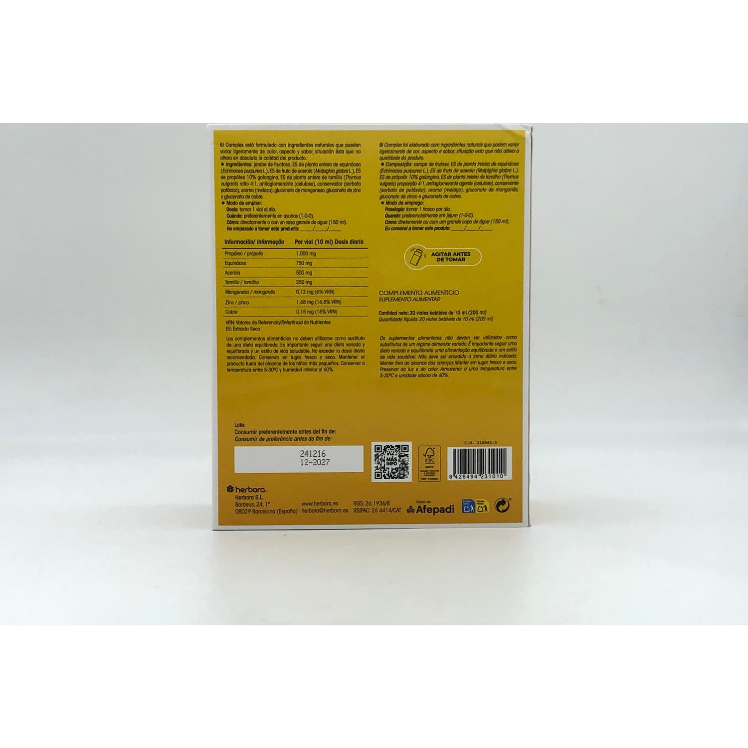 Herbora Bi Complex 20x10ml es un complemento alimenticio en formato vial que ayuda a fortalecer las defensas para prevenir resfriados. Especialmente indicado para el cambio estacional. Este complemento alimenticio combina propóleo con otros ingredientes como la equinácea, tomillo y oligoelementos que tienen propiedades antisépticas e inmunoestimulantes que ayudan a proteger el organismo de agentes externos.