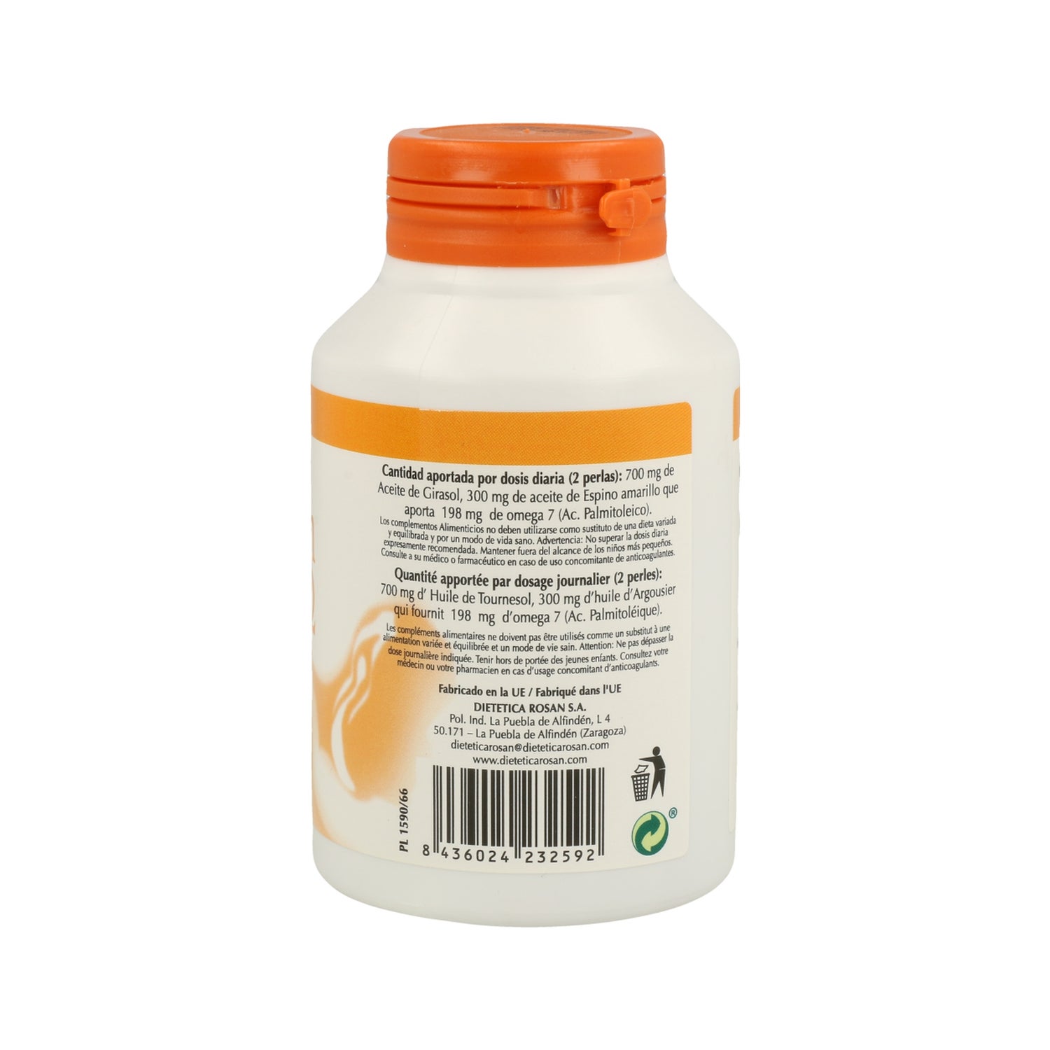 Complemento alimenticio en formato de cápsulas que está especialmente ideado para funcionar como antioxidante de las células del cuerpo, ayudando en la regeneración de las células, al reforzar el sistema inmune gracias a su compuesto que está elaborado a base de aceite de Espino Amarillo de primera presión en frío con omega 7.