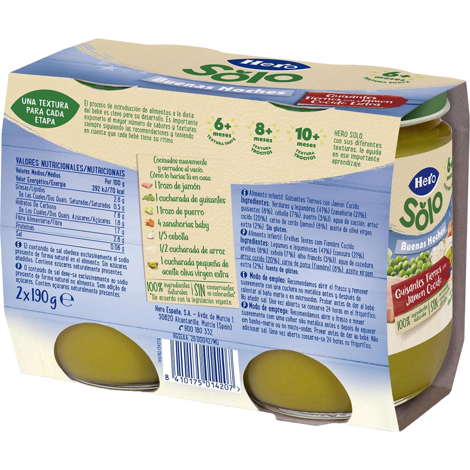 Hero Baby Buenas Noches Guisantes Tierno Jamón es un producto diseñado para bebés desde los seis meses. Este pack incluye guisantes tiernos con jamón cocido, elaborado conforme a los altos estándares de calidad de Hero. No contiene gluten, ni azúcar añadido, ni almidón, lo que lo convierte en una opción adecuada para los más pequeños.
