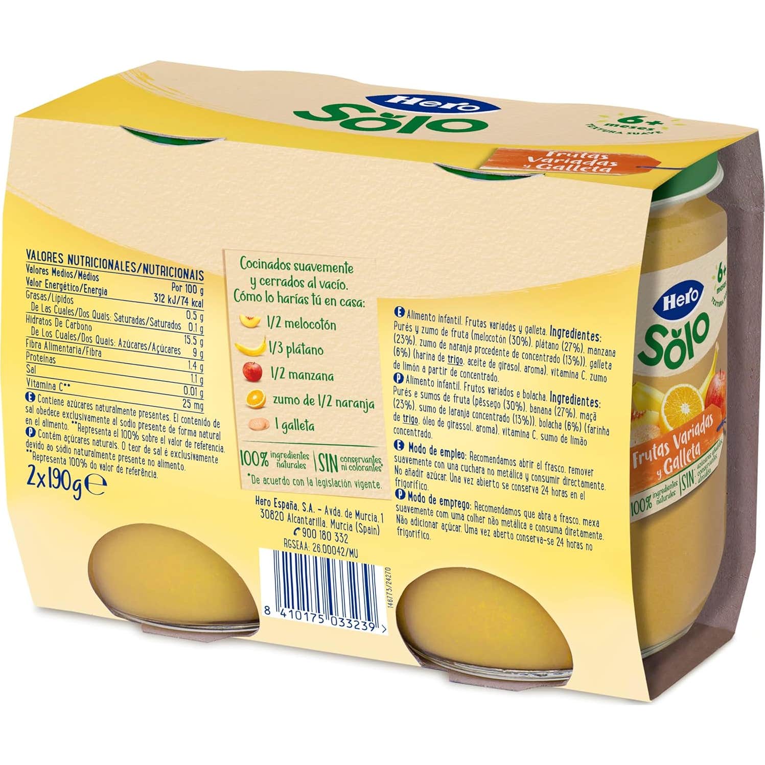 Hero Merienda Frutas Variadas y Galleta 2x190 g es un pack de dos tarros de 190 g de puré de frutas variadas con galleta, indicado para bebés a partir de 6 meses. Está pensado para la alimentación complementaria y para ofrecer una merienda práctica.