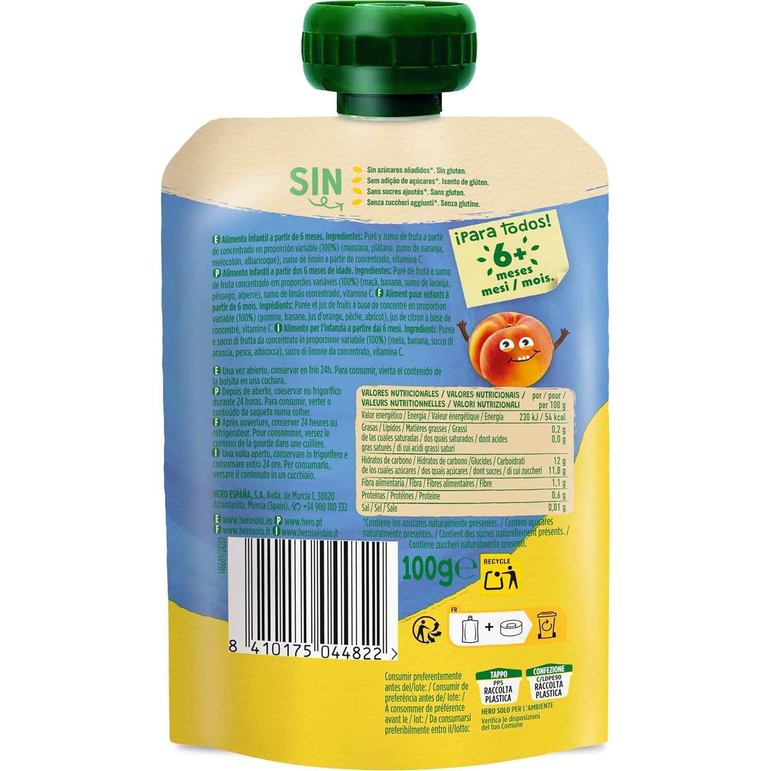 Hero Mi Fruta Mediterráneo 100 g es una bolsita de fruta pensada como alimentación complementaria a partir de los 6 meses. Está elaborada con 100% frutas seleccionadas, sin azúcares añadidos, sin aceite de palma y sin gluten. Su formato de 100 g es práctico y no necesita frío.