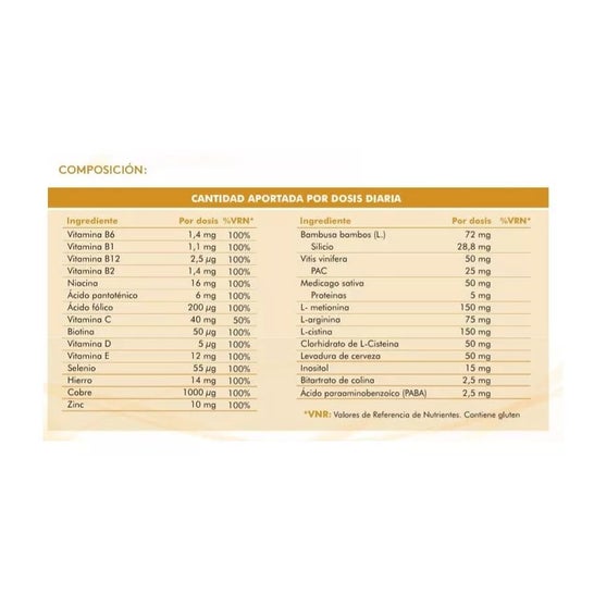 Este producto también contiene L.metionina, L-arginina, L-cistina y otros componentes beneficiosos como Clorhidrato de L-Cisteína, Levadura de cerveza, Inositol y Bitartrato de colina para promover la salud capilar y un aspecto óptimo de las uñas.