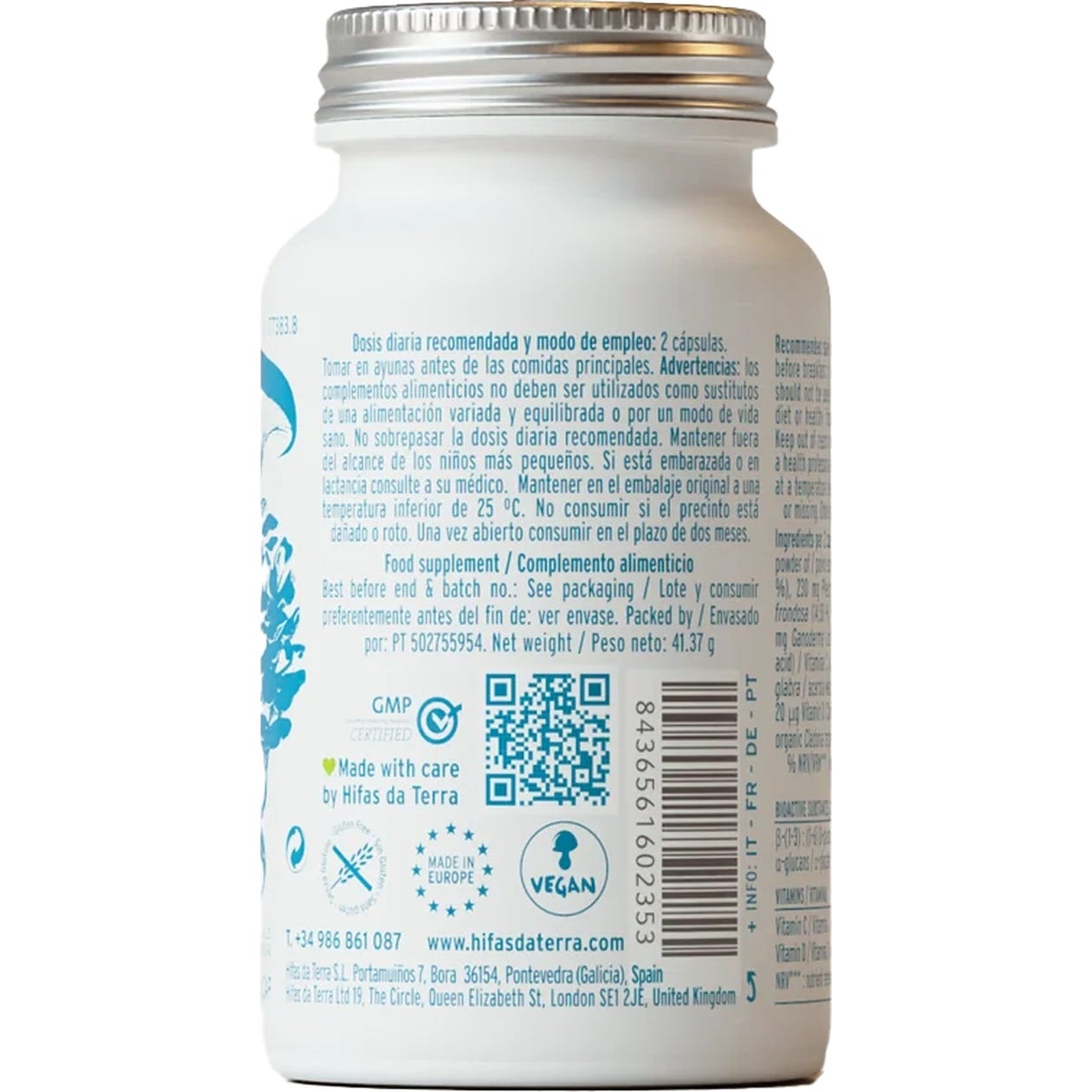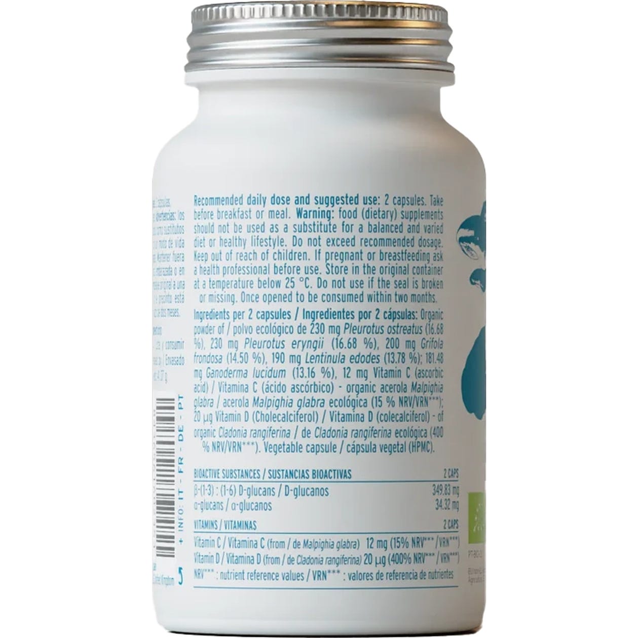 Polvo ecológico de Pleurotus ostreatus (115 mg), Polvo ecológico de Pleurotus eryngii (115 mg), Polvo ecológico de Grifola frondosa (100 mg), Polvo ecológico de Lentinula edodes (95 mg), Polvo ecológico de Ganoderma lucidum (90,74 mg), Jugo concentrado de acerola (Malpighia glabra) ecológica (38,4 mg) – 6 mg de vitamina C- y 6.29 mg extracto orgánico estandarizado de líquenes indios (Cladonia rangiferina), Vitamina D (10 μg), Cápsula vegetal.