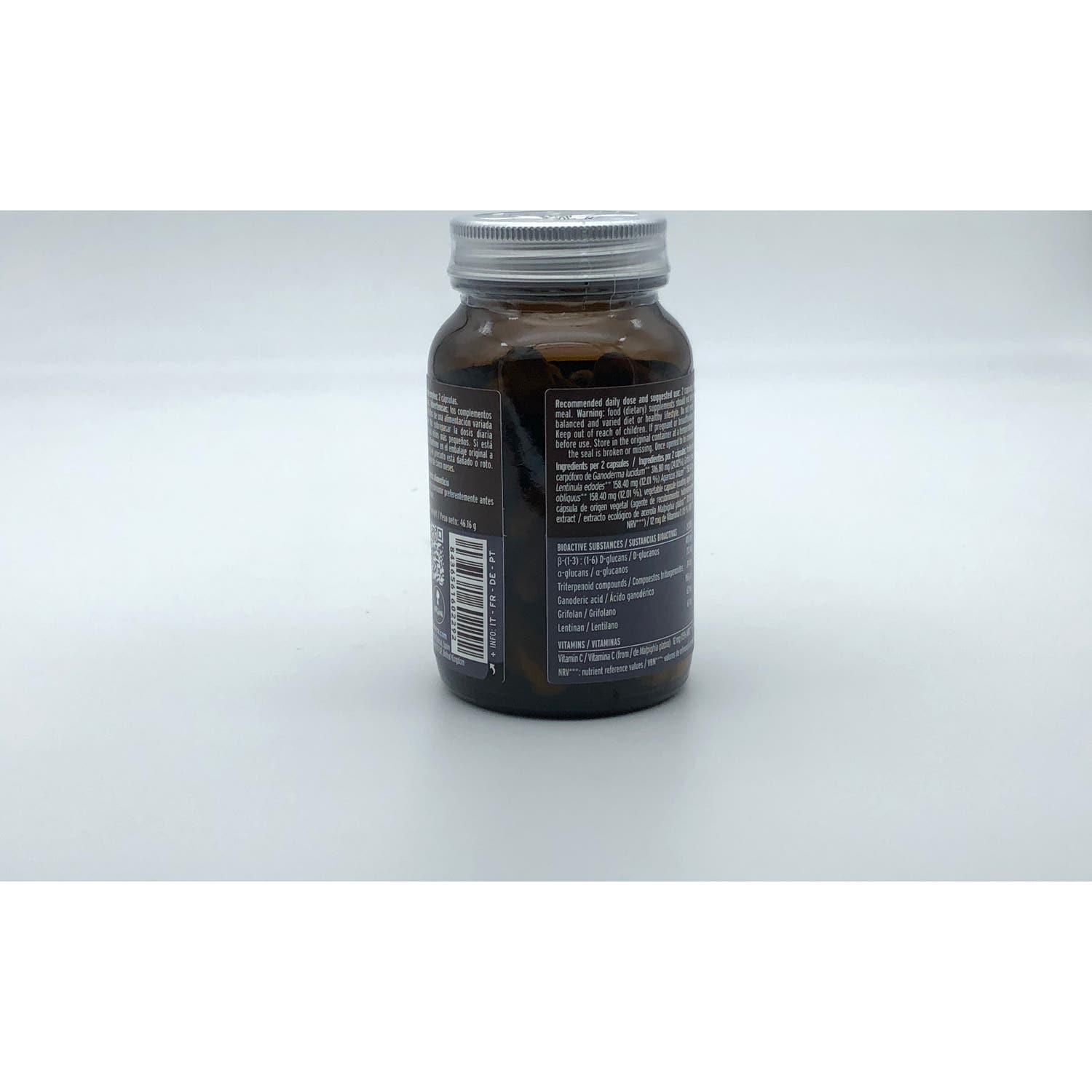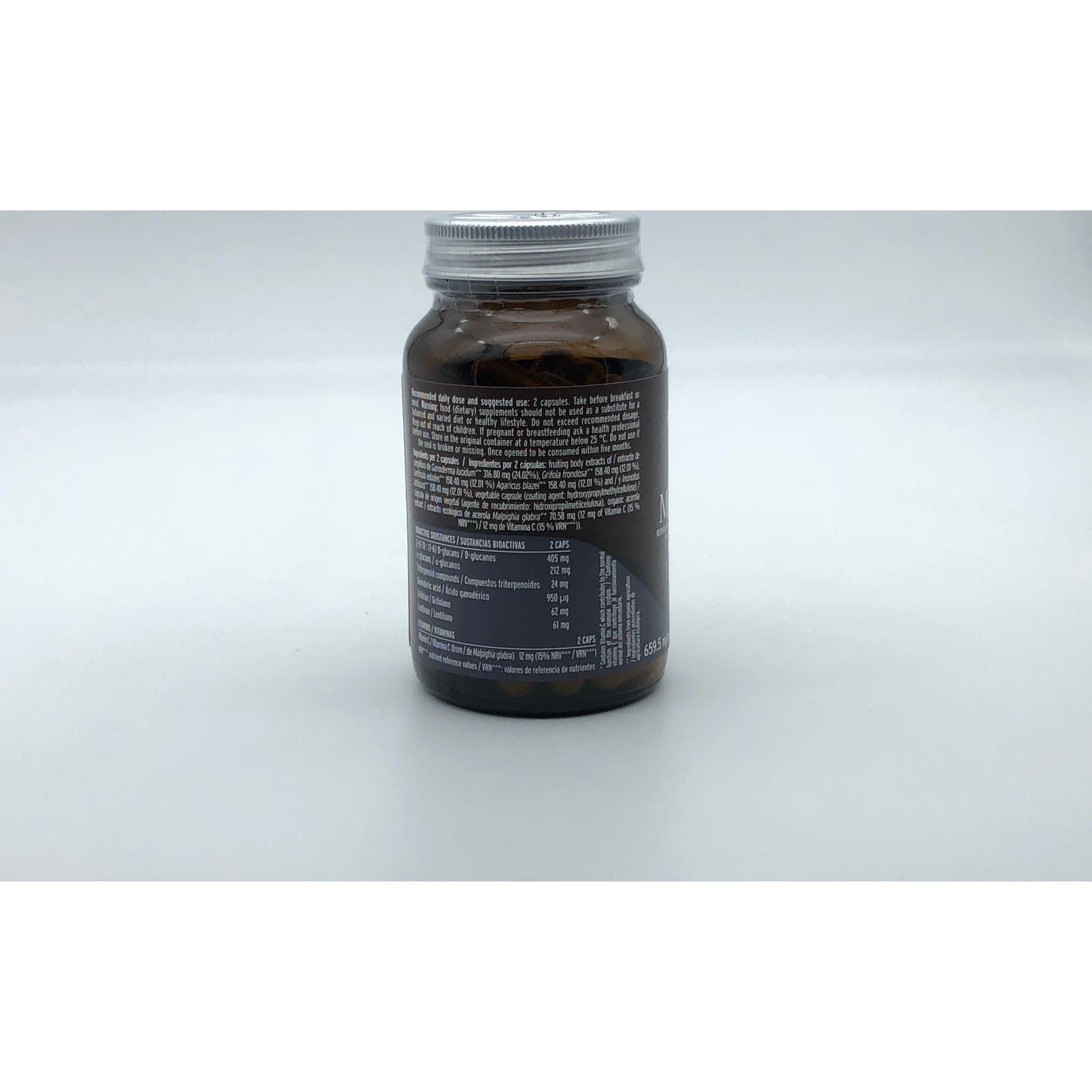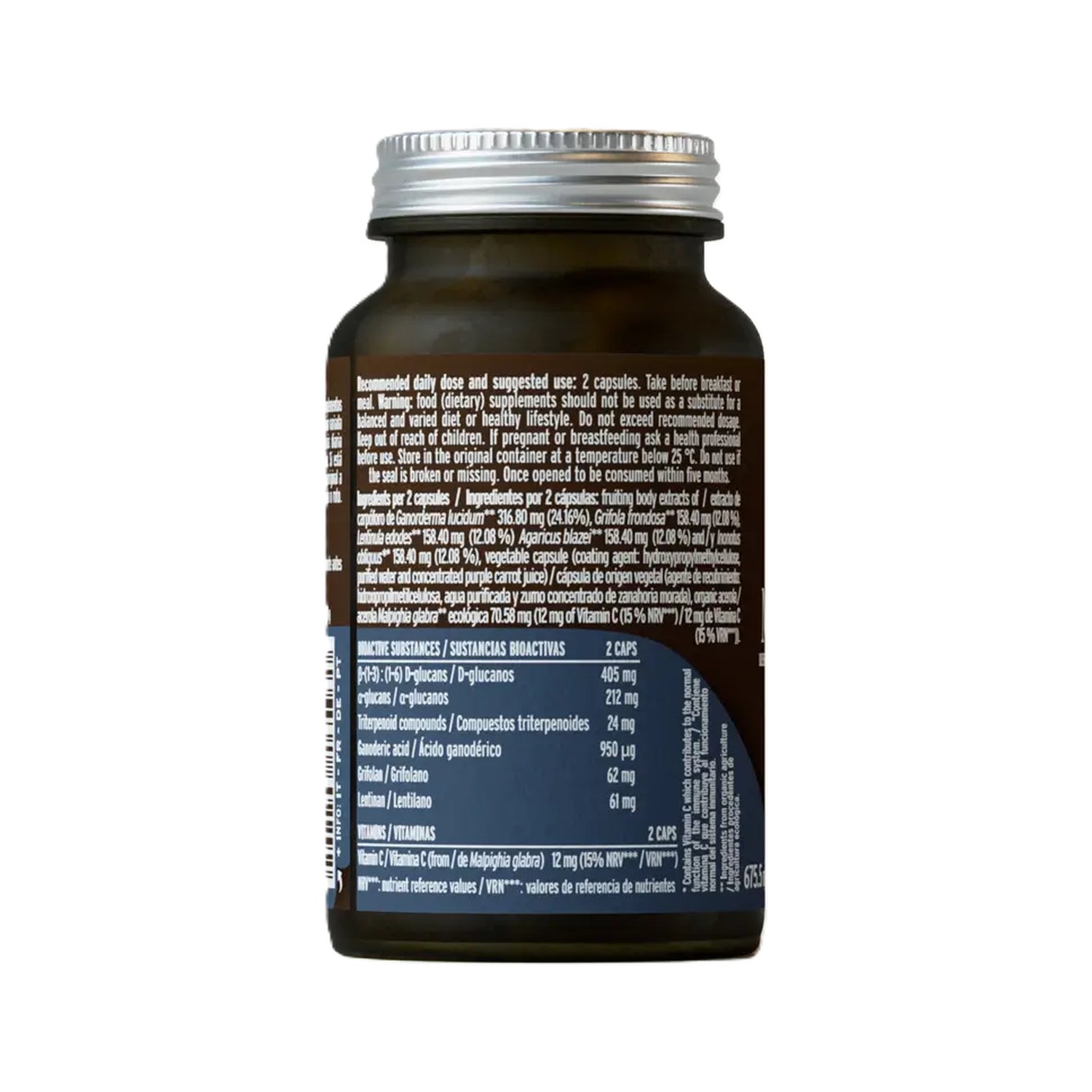 Aroma natural, Agua purificada, Extracto ecológico de Ganoderma Lucidum, Extracto ecológico de Agaricus Blazei, Extracto ecológico de Grifola Frondosa, Jugo de Agave crudo, Alpha-glucanos, Beta-Glucanos, Fruto de Myrciaria Dubiaecológica, Extracto Ecológico de Pleurotus ostreatus.