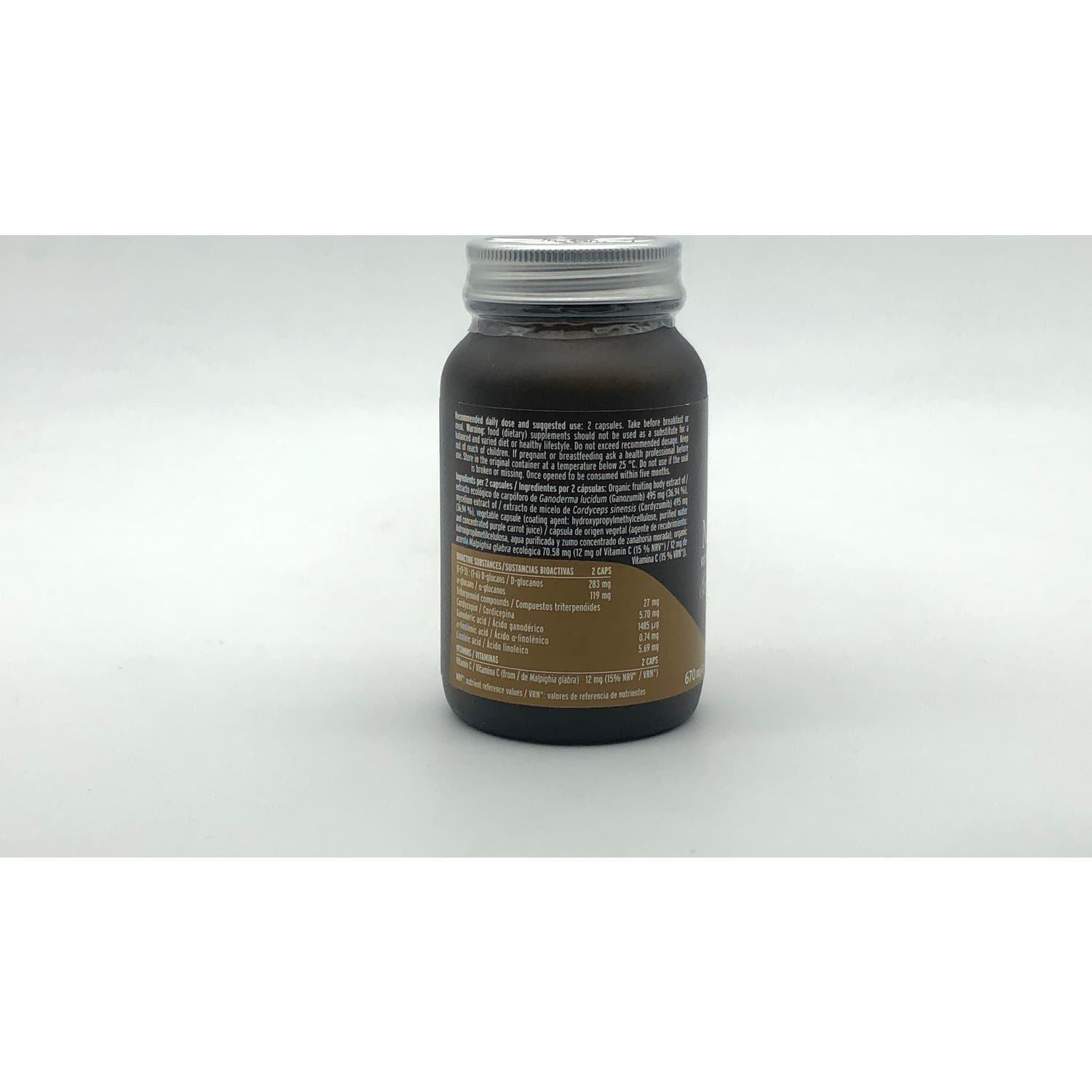 Complemento alimenticio en formato de cápsulas 100% vegetales a base de extracto puro de hongos reishi y cordyceps. Es un producto ecológico que aporta: