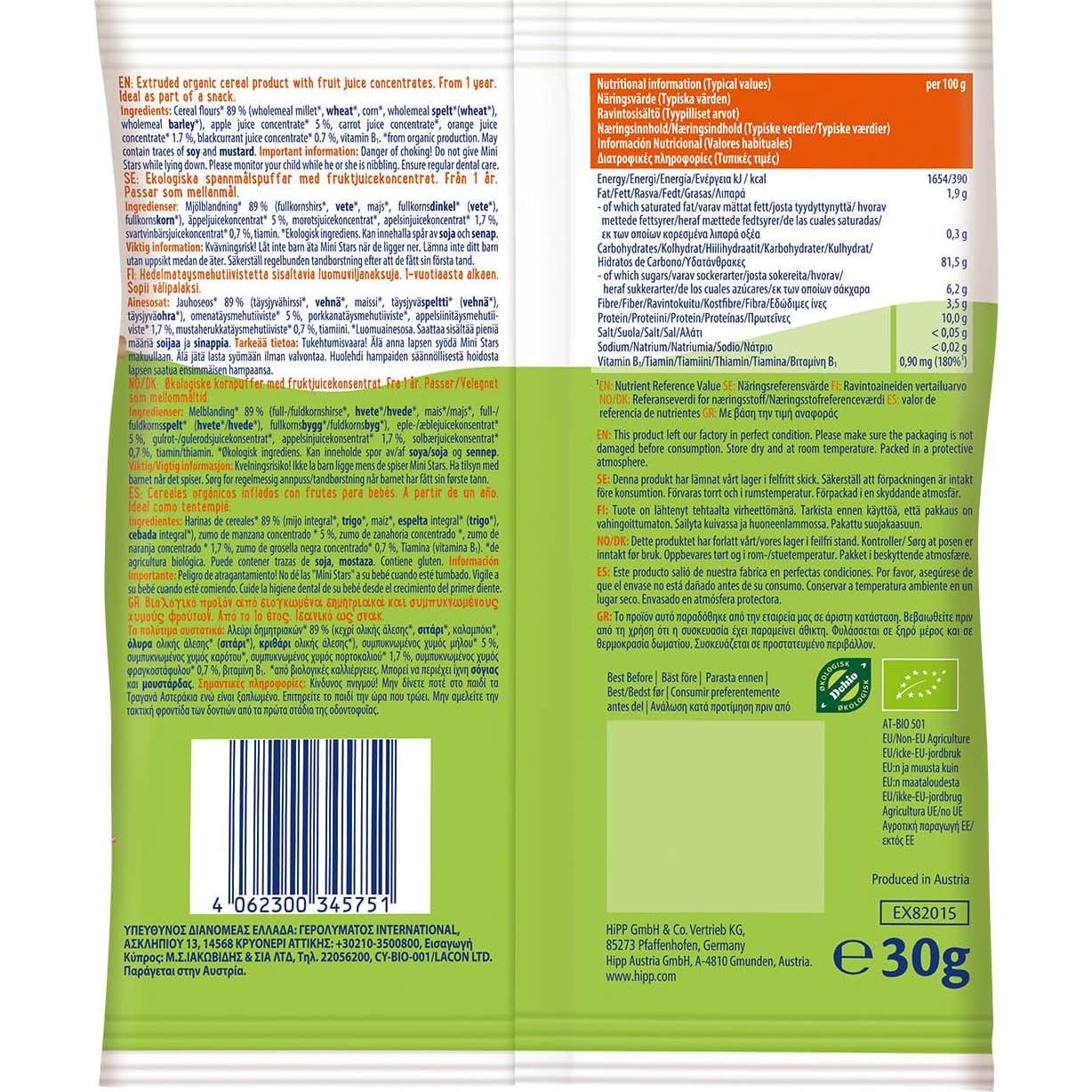 Hipp Bio Estrellitas con Frutas Snack cuenta con la reconocida calidad orgánica de HiPP, lo que lo convierte en una opción segura y confiable. Este snack es ideal para disfrutar entre comidas, ya sea en casa o durante los viajes, y su tamaño es perfecto para manos pequeñas. Se recomienda supervisar el consumo por parte de un adulto.
