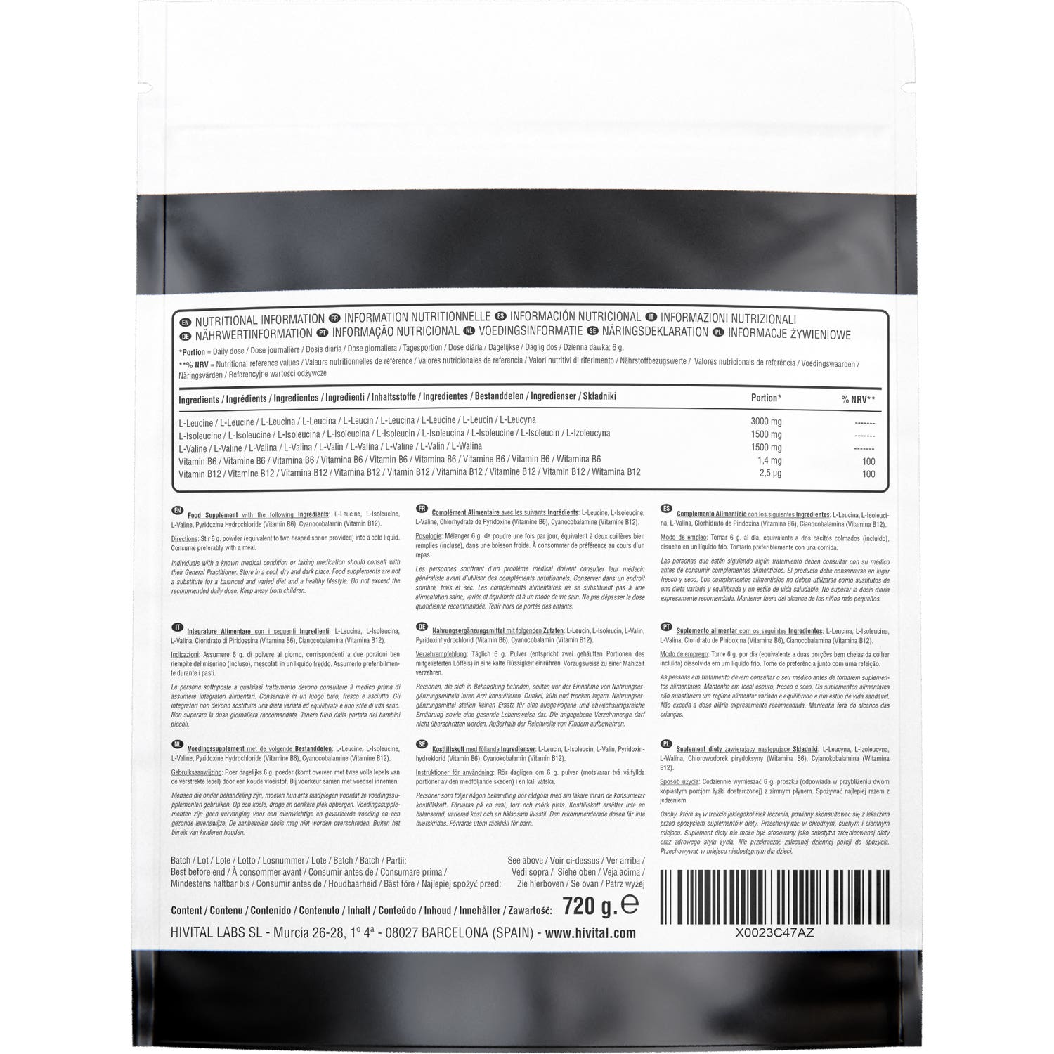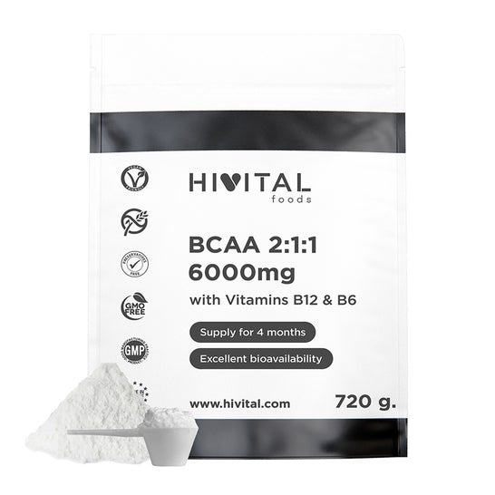 EXCELENTE FÓRMULA a base de los tres BCAA (L-Leucina, L-Isoleucina, L-Valina), Vitamina B6 y Vitamina B12.