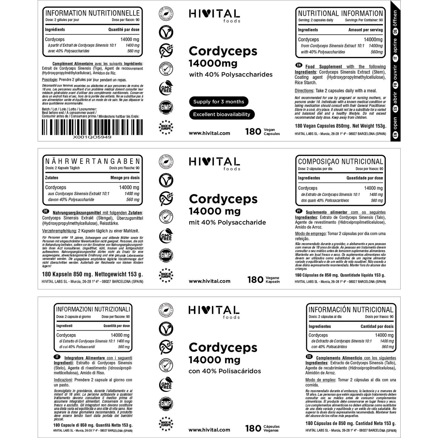 EL MEJOR CORDYCEPS: Cada dosis (2 cápsulas) está elaborada con 1400 mg de Extracto Natural de Cordyceps Sinensis concentrado con un ratio 10:1 y un 40% en Polisacáridos, aportando: