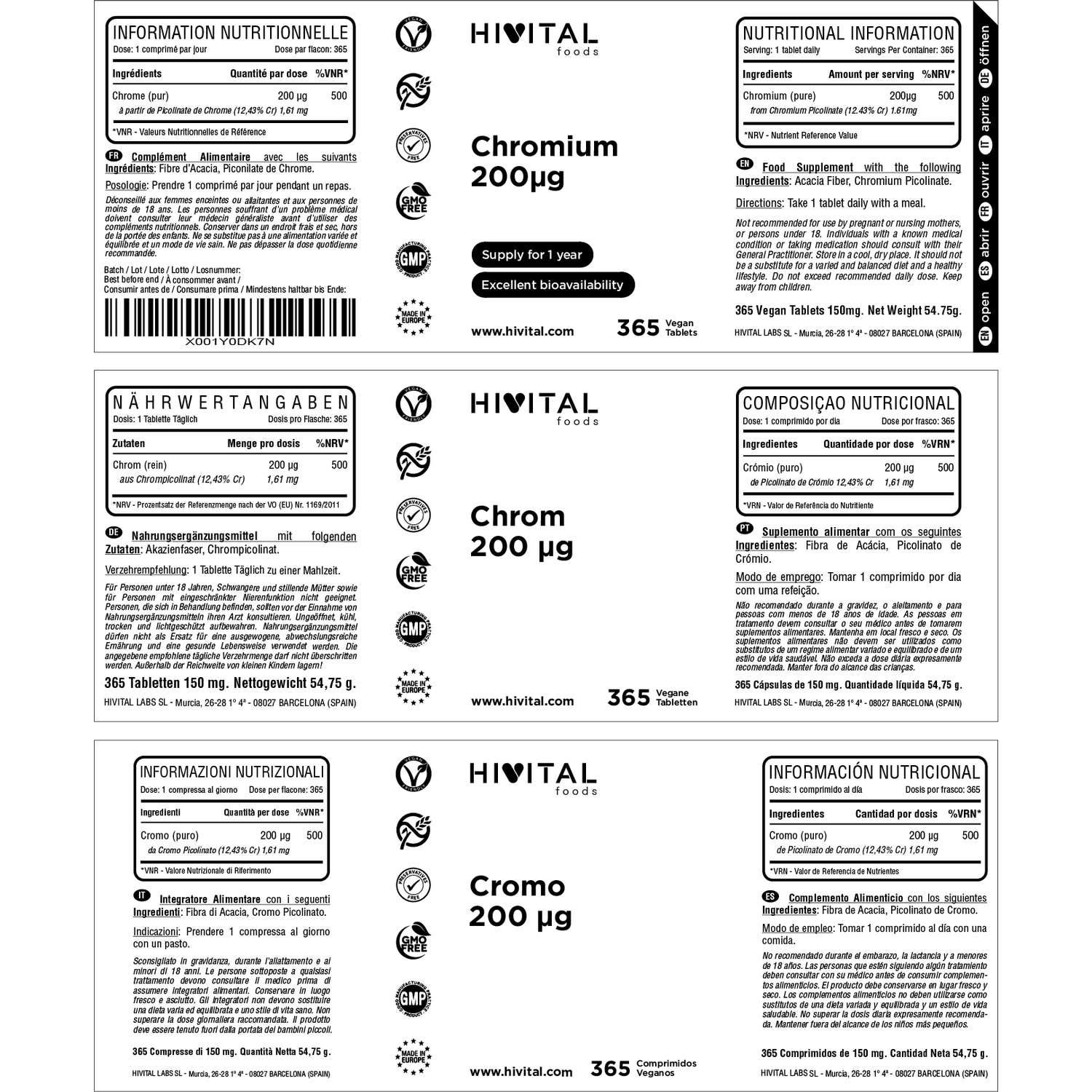 EL MEJOR CROMO: Cada comprimido está elaborado con 1,61 mg de Picolinato de Cromo aportando 200 mcg de Cromo puro. La sal orgánica Picolinato tiene una gran biodisponibilidad y absorción.