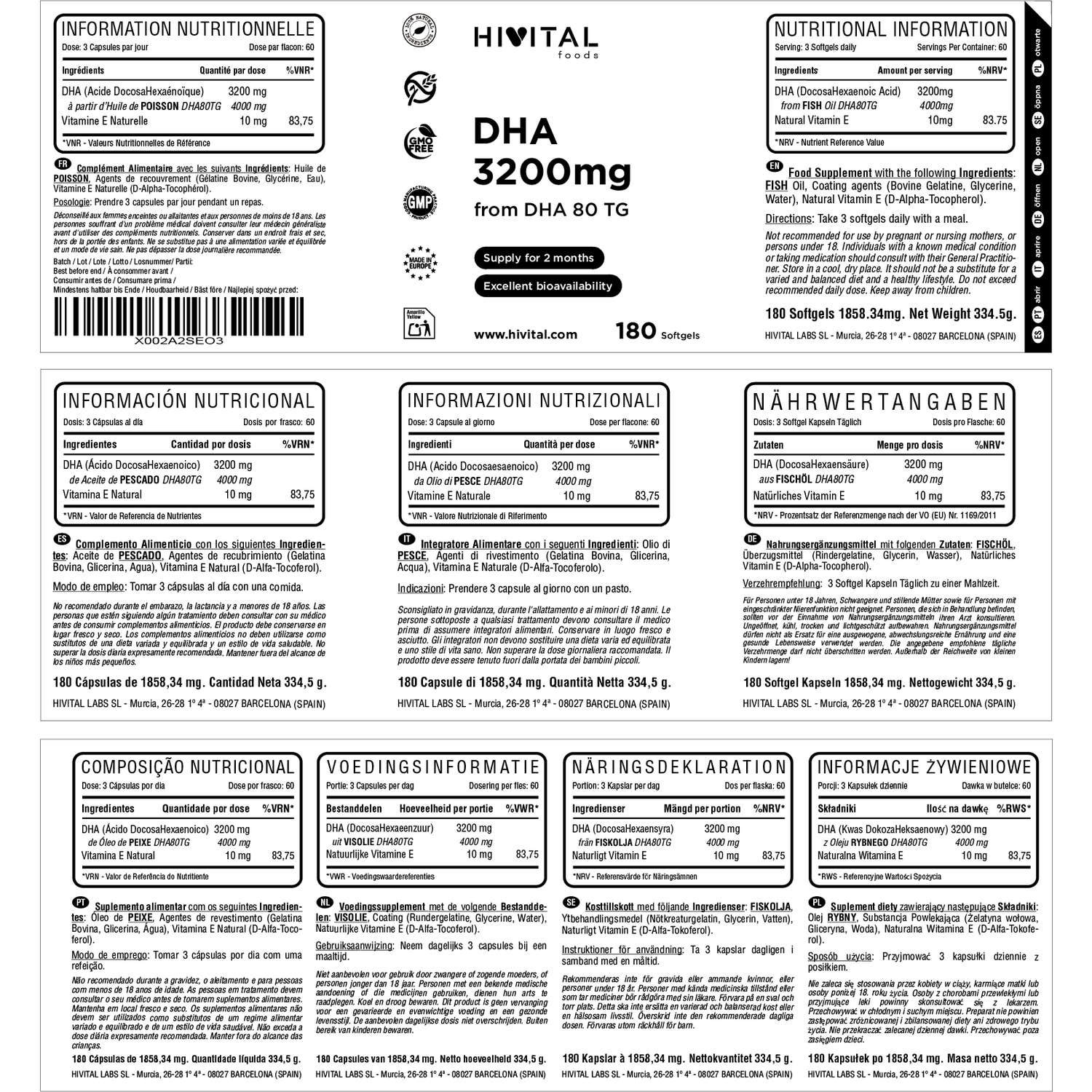 EXCELENTE FÓRMULA a base de 3200 mg de DHA (Ácido DocosaHexaenoico) en su forma de Triglicérido (TG) para maximizar la absorción, y 10 mg de Vitamina E Natural D-Alfa Tocoferol. Usamos Aceite de Pescado Natural purificado totalmente libre de Metales Pesados y Tóxicos.