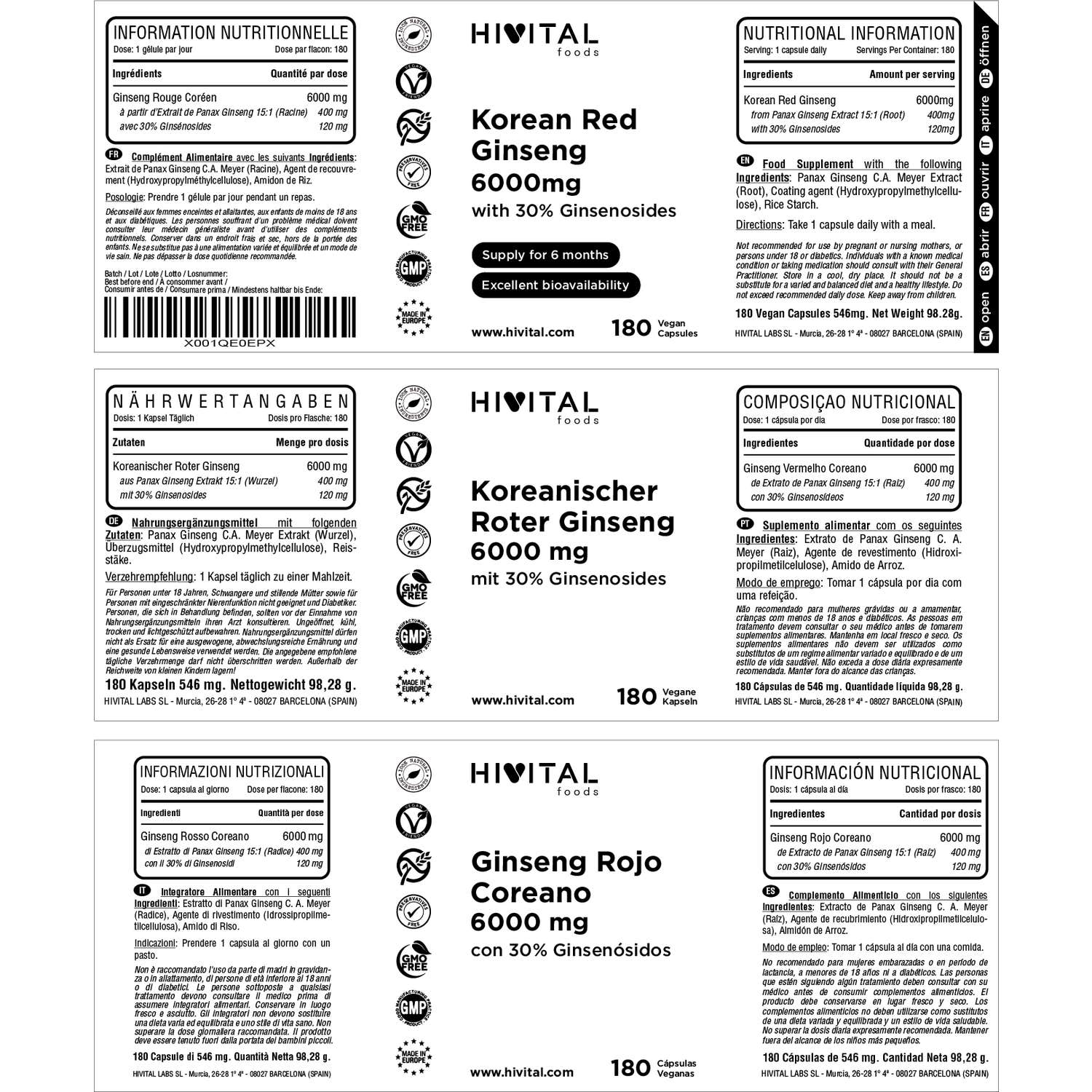 EXCELENTE FÓRMULA a base de Extracto Natural de Ginseng Rojo Coreano concentrado a partir de Raíz al 15:1 (con un 30% de Ginsenósidos) aportando 120 mg de Ginsenósidos por cápsula, lo que garantiza su total eficacia.