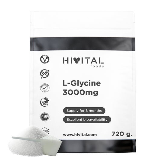 EXCELENTE FÓRMULA a base de L-Glicina vegana. El aminoácido Glycin es proteogénico y sintetiza el L-Glutatión, la Creatina y la hemoglobina. La Glycine también sintetiza Colágeno.