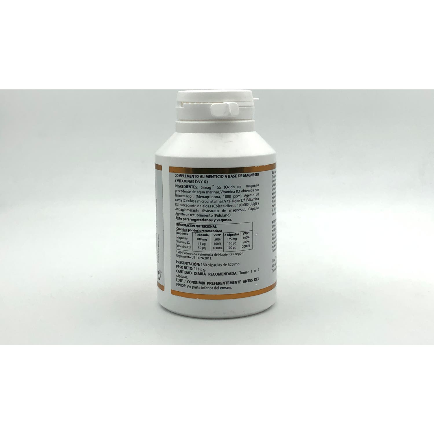 Complemento alimenticio formulado con la vitamina D3 con procedencia de vegetales, como son las algas y los líquenes con origen en el norte de Canadá. La vitamina K2 procede del natto (vegetal fermentado) procedente del mar.
