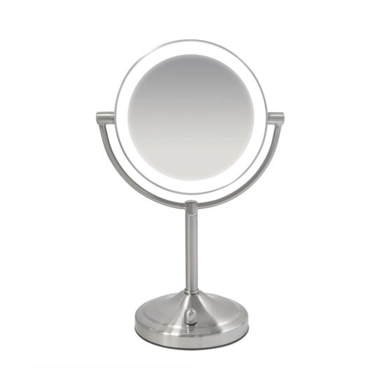 Espejo de mesa inclinable con 7 aumentos y una cabeza inclinable de 360º en color níquel satinado que está especialmente diseñado para poder realizar la rutina de limpieza facial o bien el maquillaje de una manera cómoda, gracias a la luz led incorporada que ayuda a ver con más detalle el rostro. Funciona con 4 pilas AAA y es posible regular la intensidad de la luz.