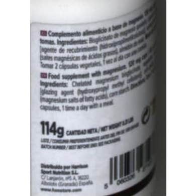 100% Bisglicinato de Magnesio Quelado en cápsulas vegetales. Dosis diaria de 350mg. Producto apto para vegetarianos y veganos.