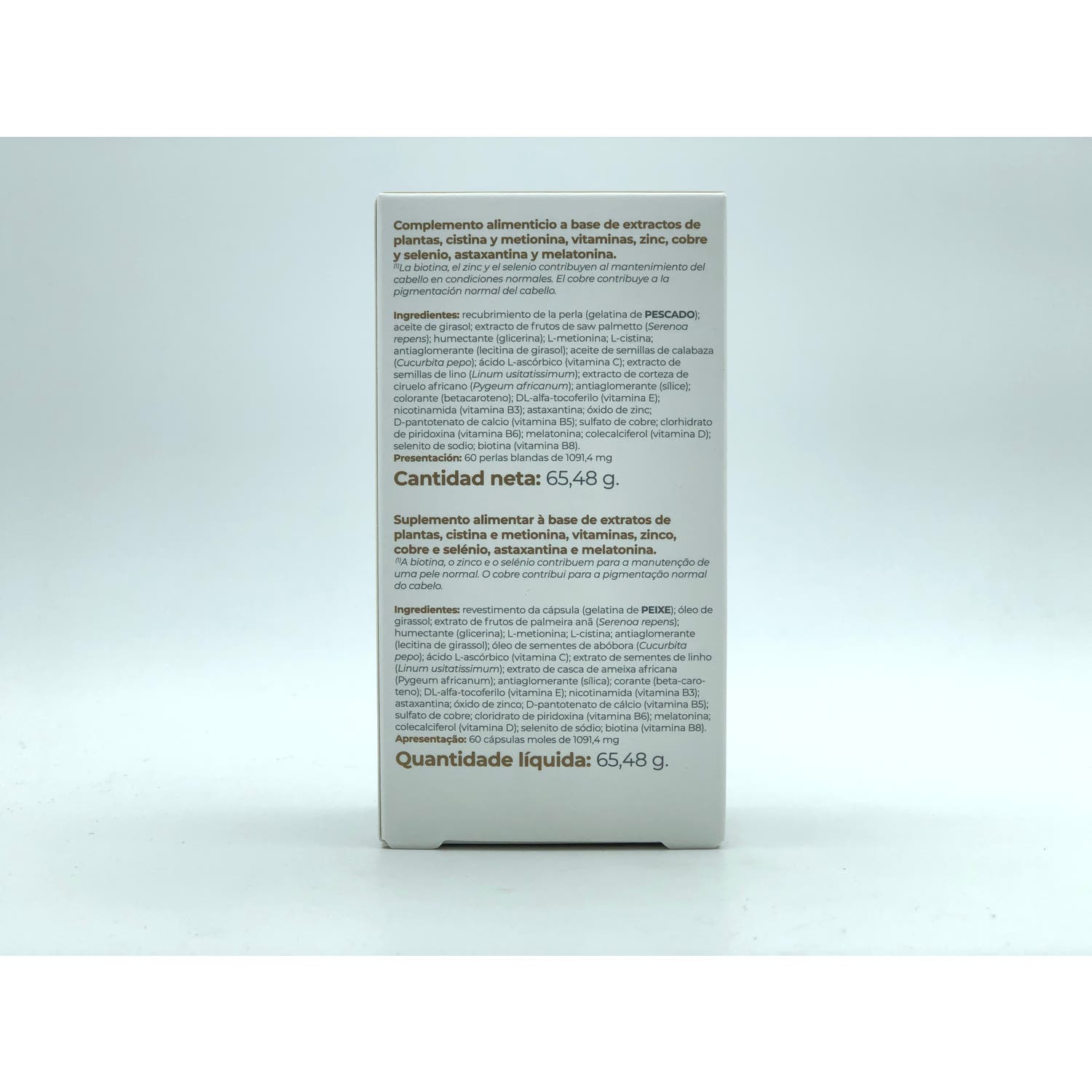 Ingredientes: emulsionantes (aceite de girasol (Helianthus annuus L.)); recubrimiento de pescado (gelatina de pescado); extracto de saw palmetto (Serenoa serrulata (Michx.) Nichols.); humenctante (glicerina); L-metionina, L-cisteina, antiaglomerantes (lecitina de girasol); extracto de semillas de calabaza (Curcubita pepo L.); vitamina C (ácido ascórbico); extracto de semillas de lino (Linum usitatissimum L.); extracto de pygeum africanum (Prunus africana (Hook. f.) Kalkman); silicio coloidal; colorante betacaroteno; vitamina E (D-alfa-tocoferol); vitamina B5 (nicotinamida); AstaReal® 10% astaxantina (Haematococcus pluvialis J. Von Flotow); óxido de zinc; vitamina B5 (D-pantotenato de calcio); sulfato de cobre; vitamina B6 clorhidrato de piridoxina); melatonina; vitamina D3 (colecalciferol); selenito de sodio; vitamina B8 (biotina).